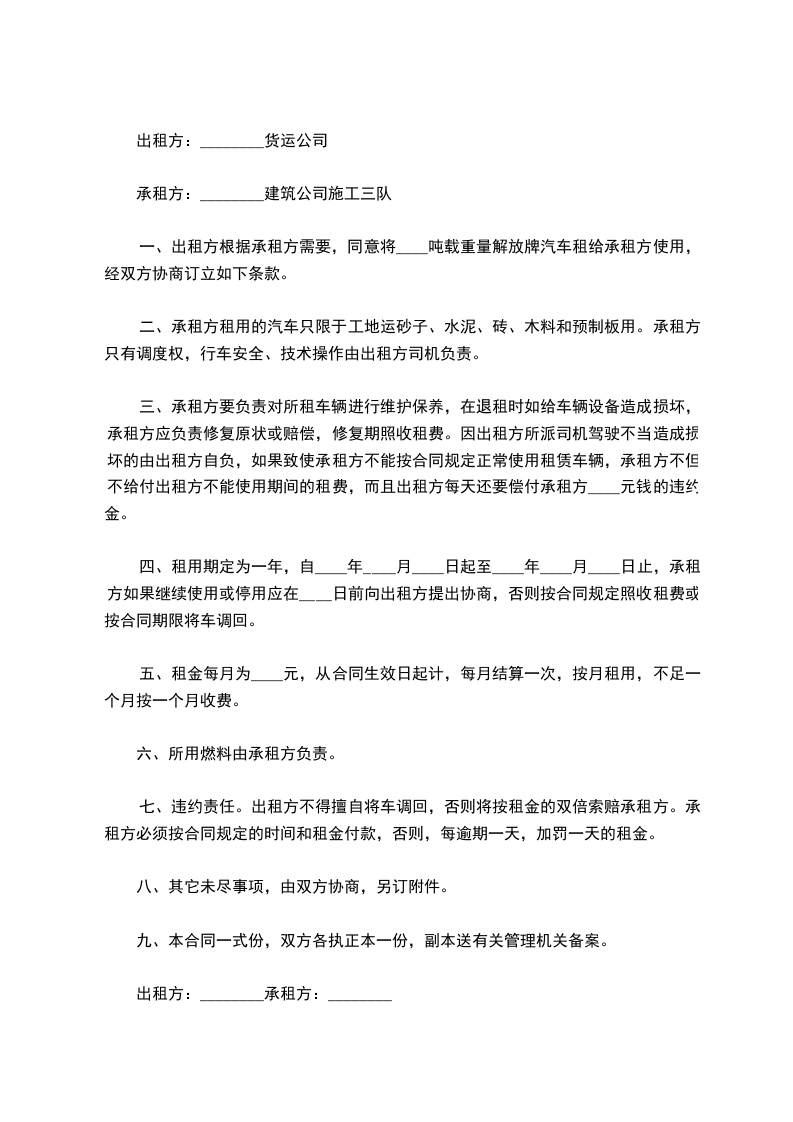 一、出租方根据承租方需要,同意将____吨载重量解放牌汽车租给承租方使用,经双方协商订立如下条款。