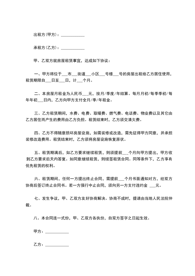 一、甲方将位于___市___街道___小区___号楼___号的房屋出租给乙方居住使用,租赁期限自___日至___日,计___个月。