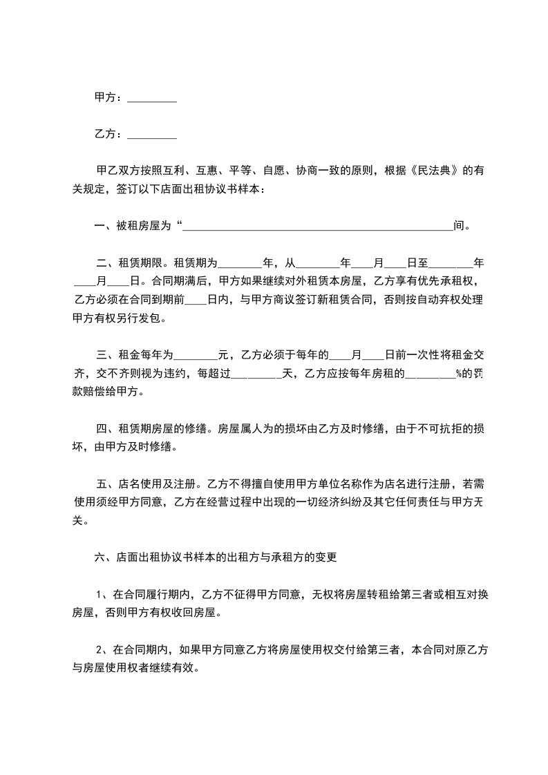 甲乙双方按照互利、互惠、平等、自愿、协商一致的原则,根据《民法典》的有关规定,签订以下店面出租协议书样本: