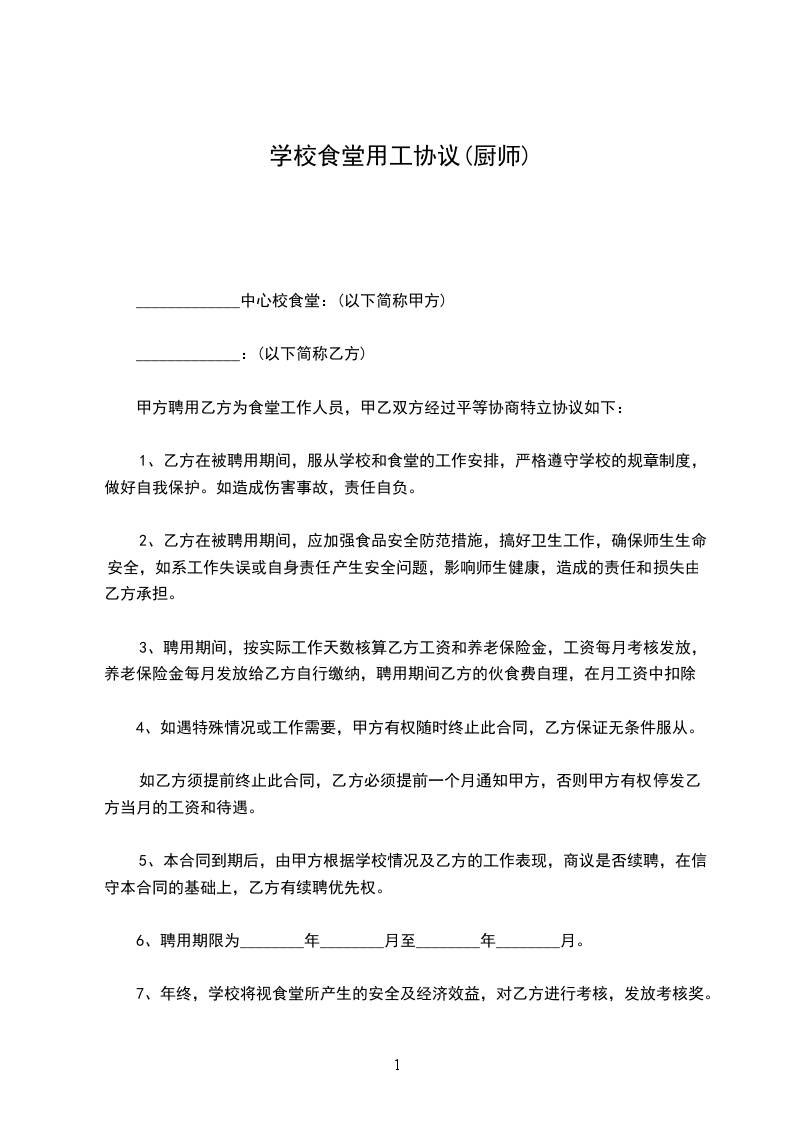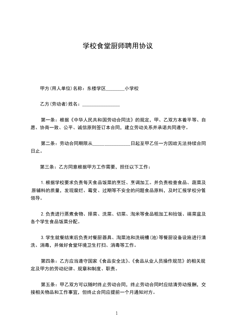 根据《中华人民共和国劳动法》,甲方因工作需要,决定聘用乙方担任食堂工作人员,经双方协商达成如下协议: