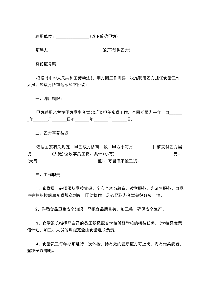 甲方聘用乙方在甲方学生食堂(部门)担任食堂工作。合同期限为一年,自_______年_______月_______日至_______年_______月_______日。