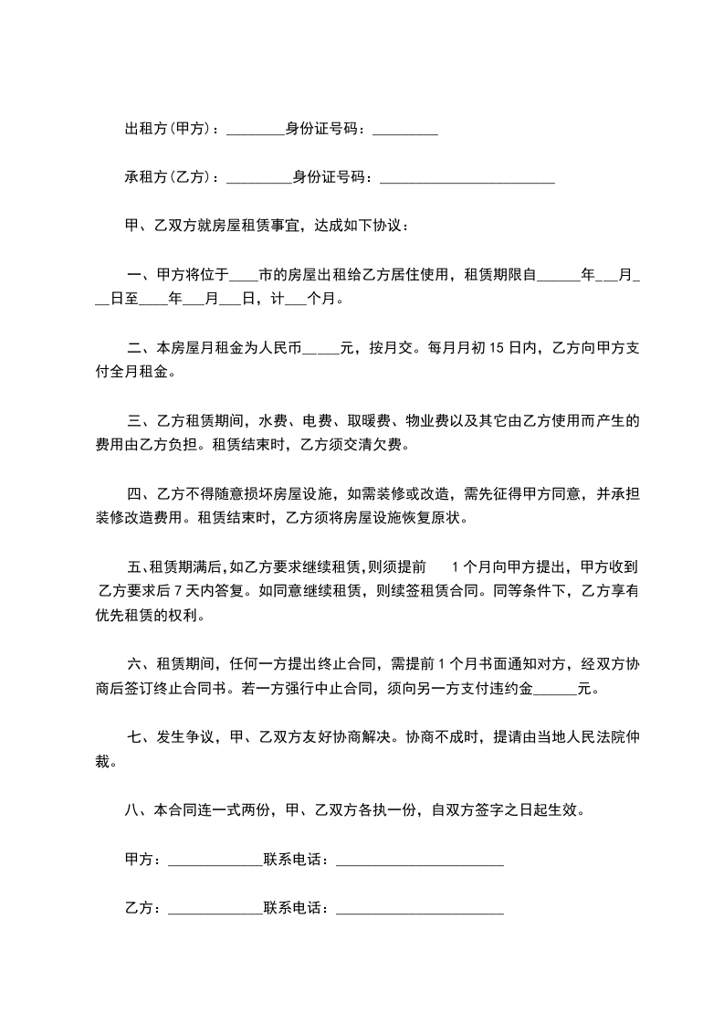 承租方(乙方):_________身份证号码:________________________