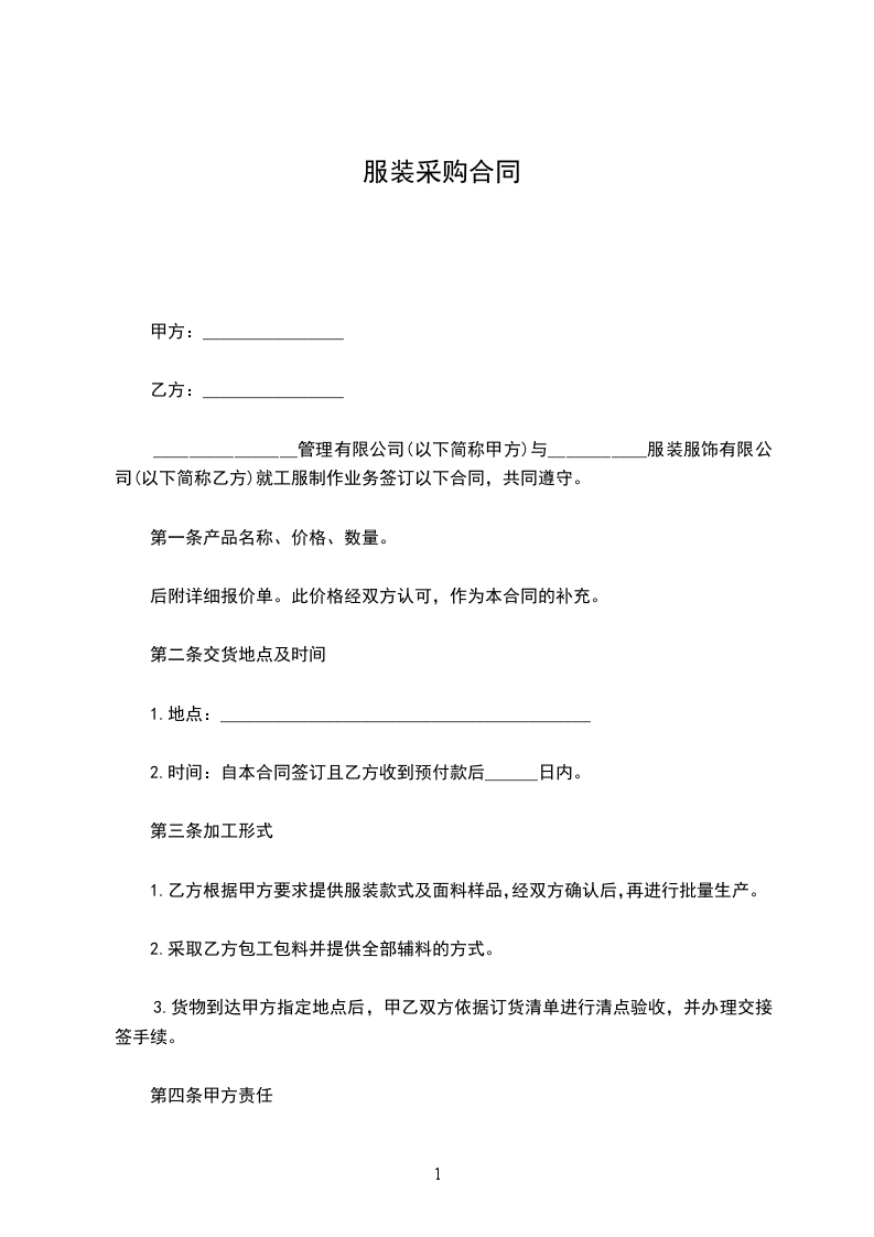 ________________管理有限公司(以下简称甲方)与___________服装服饰有限公司(以下简称乙方)就工服制作业务签订以下合同,共同遵守。