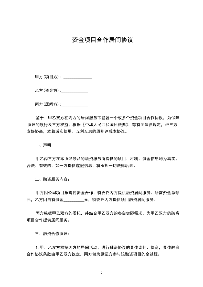 鉴于:甲乙双方在丙方的居间服务下签署一个或多个资金项目合作协议,为保障协议的履行及三方权益,根据《中华人民共和国民法典》、等有关法律规定,经三方友好协商,本着诚实信用、互利互惠的原则达成本协议。