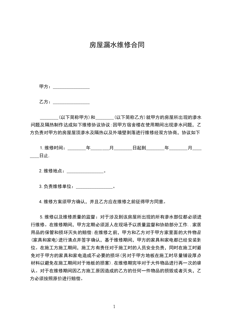 5.维修以及维修质量的监督:对于涉及到该房屋所出现的所有渗水部位都必须进行维修。在维修期间,甲方定期必须派人在现场予以质量监督和协助部分工作..家居用品的保管和损坏灭失的赔偿:在维修之前,甲方和乙方对于甲方家里面的大件物品(家具和家电)进行清点并签字确认,基于维修期间,甲方的家具和家电都已经安装到位。在施工方施工期间,施工方有责任对于施工时的人员安全负责,同时在施工时避免对于甲方的家具和家电造成不必要的损坏(另对于甲方地板在施工时尽量铺设厚点材料以避免在施工期间对于地板的损害).在维修期完毕对于大件物品进行再一次的确认。对于在维修期间因乙方施工原因造成的乙方的任何一件物品的损毁或者灭失,乙方必须按照原价进行赔偿。
