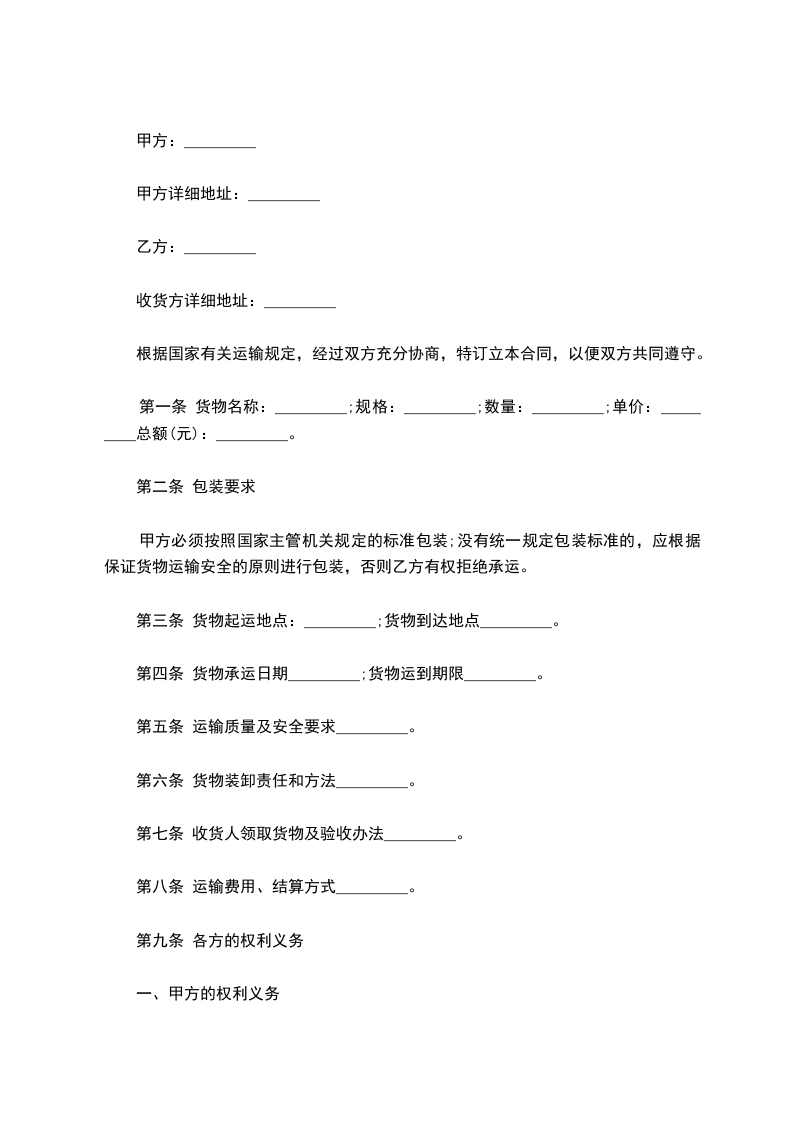 2.乙方的义务:在合同规定的期限内,将货物运到指定的地点,按时向收货人发出货物到达的通知。对托运的货物要负责安全,保证货物无短缺、无损坏、无人为的变质,如有上述问题,应承担赔偿义务。在货物到达以后,按规定的期限,负责保管。