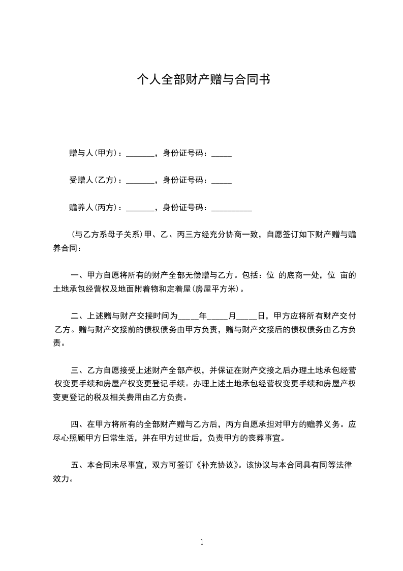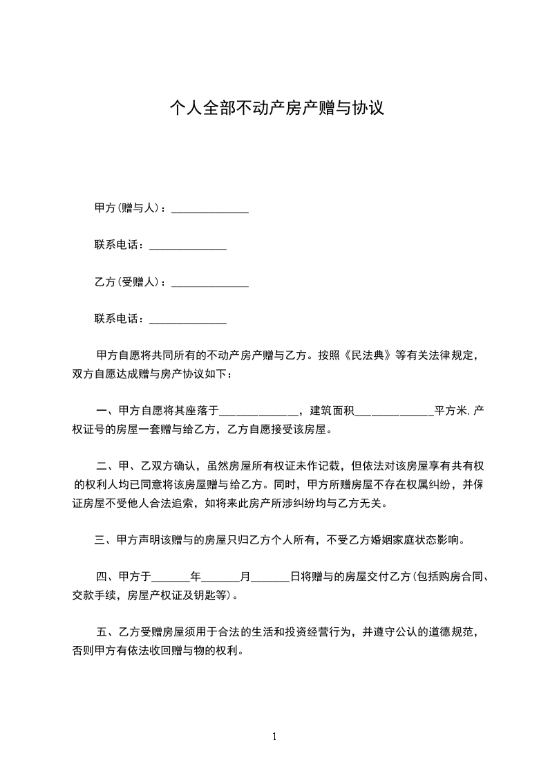 1._________(受赠人姓名):赠与其坐落于_________市_________区_________大街_________号平房五间,房产权证号为:_________。