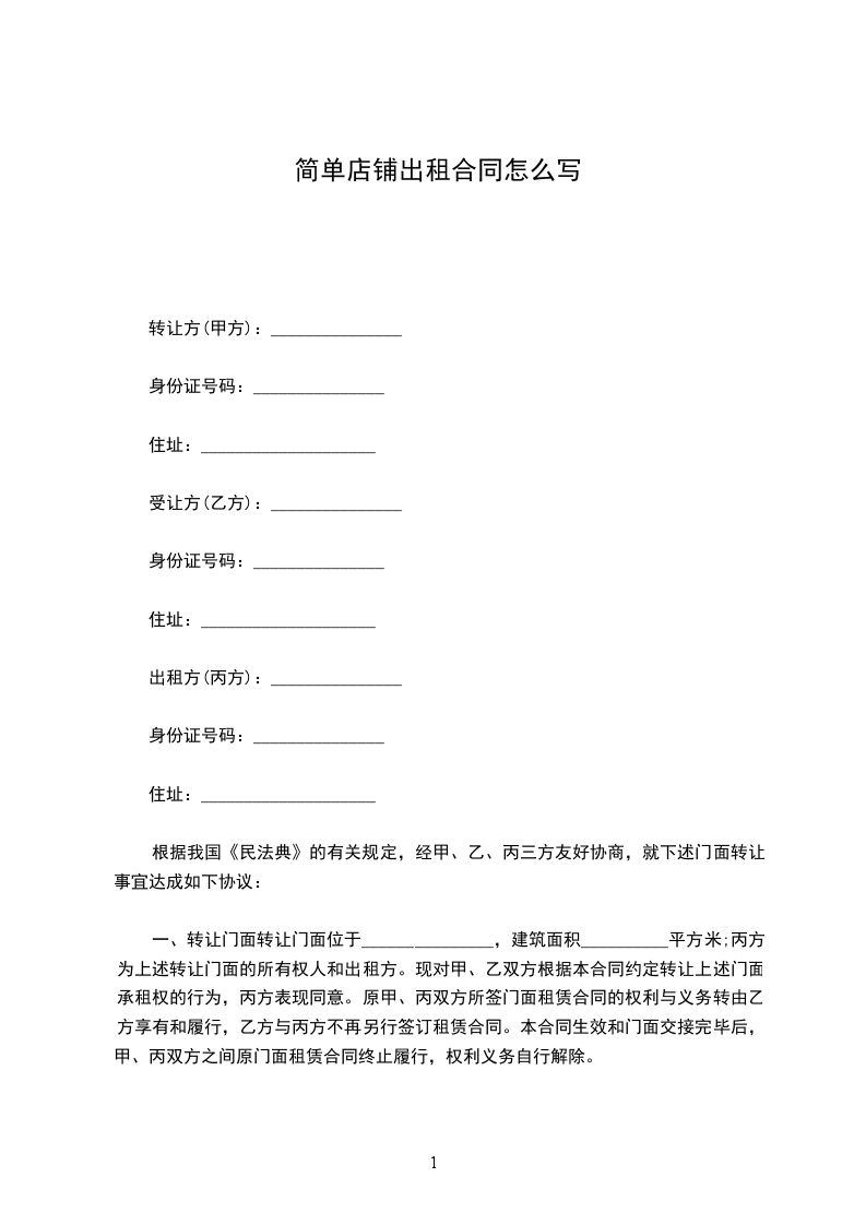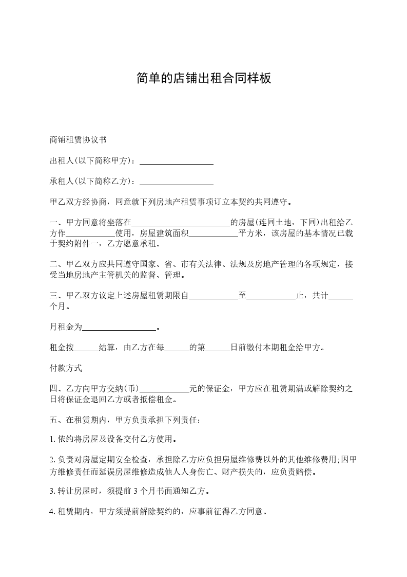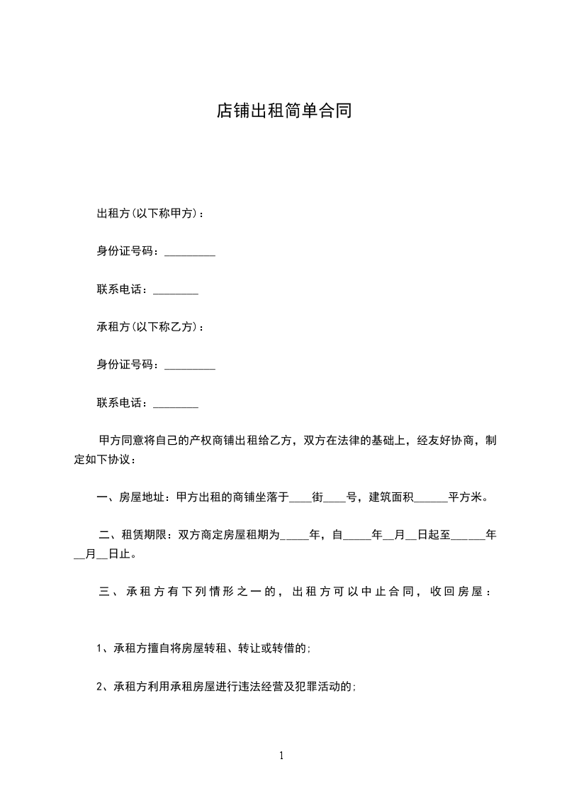 一、房屋地址:甲方出租的商铺坐落于____街____号,建筑面积______平方米。