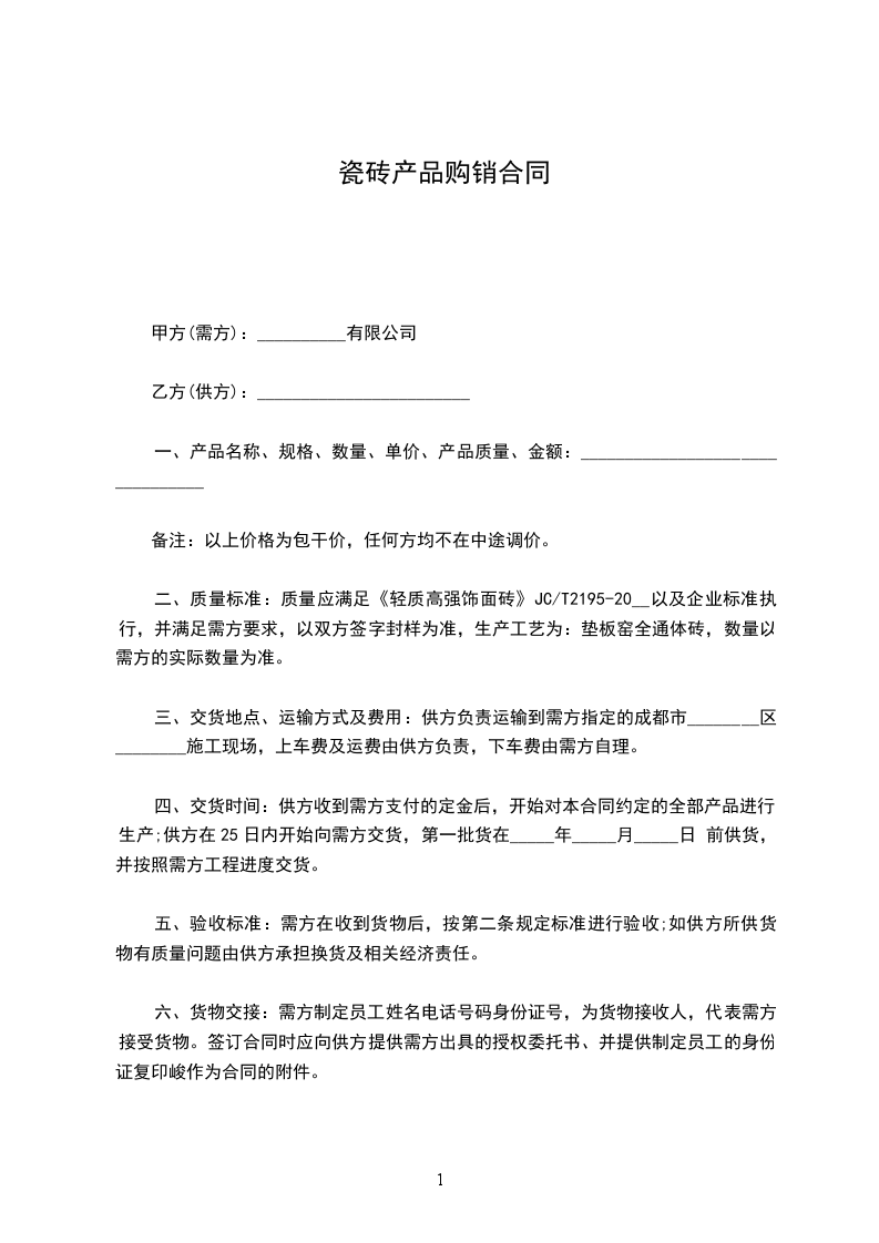 二、质量标准:质量应满足《轻质高强饰面砖》JC/T2195-20__以及企业标准执行,并满足需方要求,以双方签字封样为准,生产工艺为:垫板窑全通体砖,数量以需方的实际数量为准。
