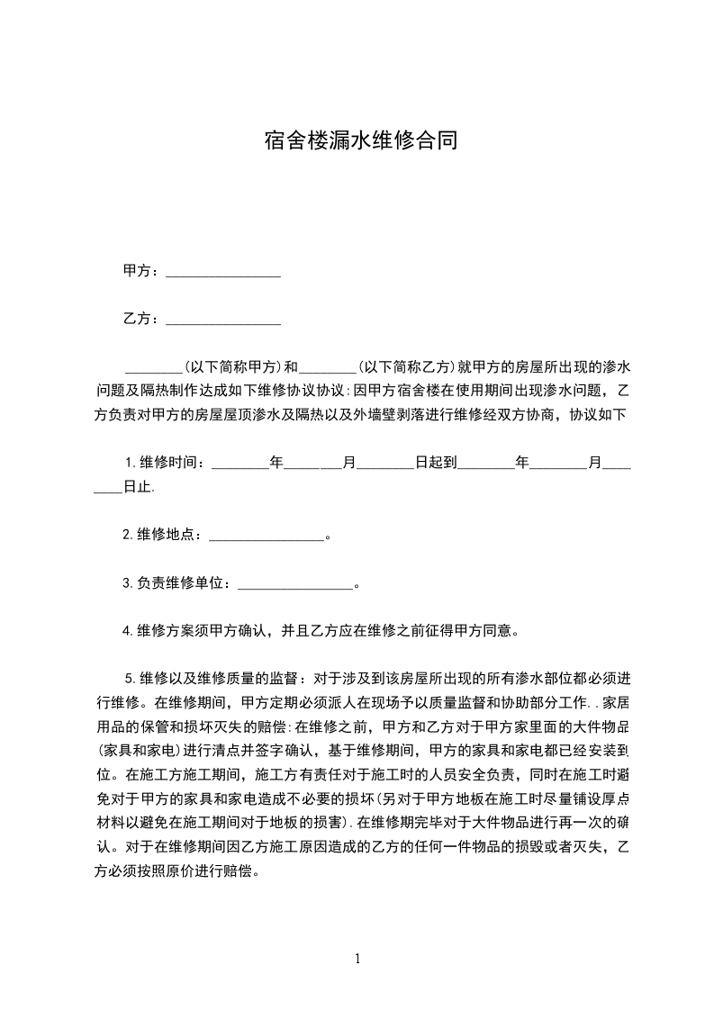 5.维修以及维修质量的监督:对于涉及到该房屋所出现的所有渗水部位都必须进行维修。在维修期间,甲方定期必须派人在现场予以质量监督和协助部分工作..家居用品的保管和损坏灭失的赔偿:在维修之前,甲方和乙方对于甲方家里面的大件物品(家具和家电)进行清点并签字确认,基于维修期间,甲方的家具和家电都已经安装到位。在施工方施工期间,施工方有责任对于施工时的人员安全负责,同时在施工时避免对于甲方的家具和家电造成不必要的损坏(另对于甲方地板在施工时尽量铺设厚点材料以避免在施工期间对于地板的损害).在维修期完毕对于大件物品进行再一次的确认。对于在维修期间因乙方施工原因造成的乙方的任何一件物品的损毁或者灭失,乙方必须按照原价进行赔偿。