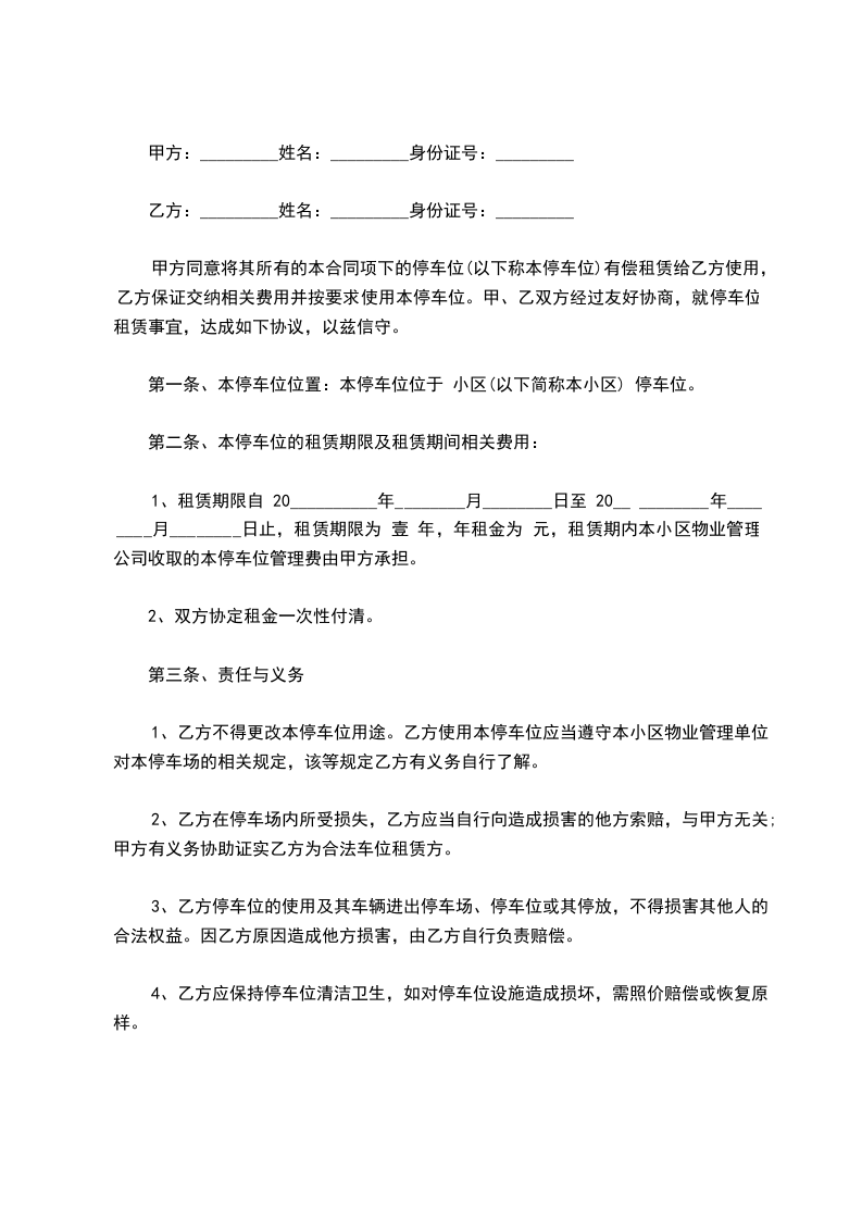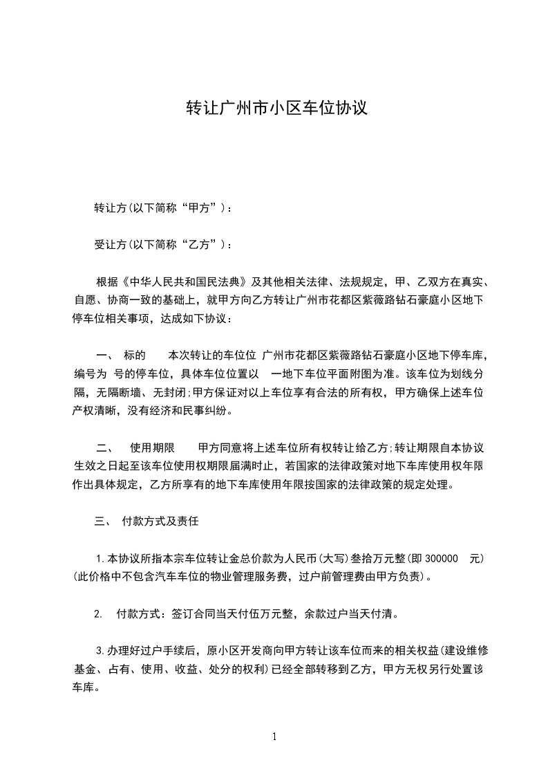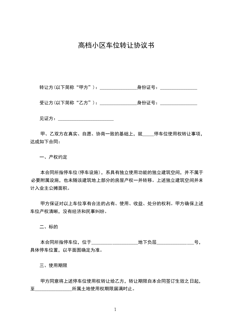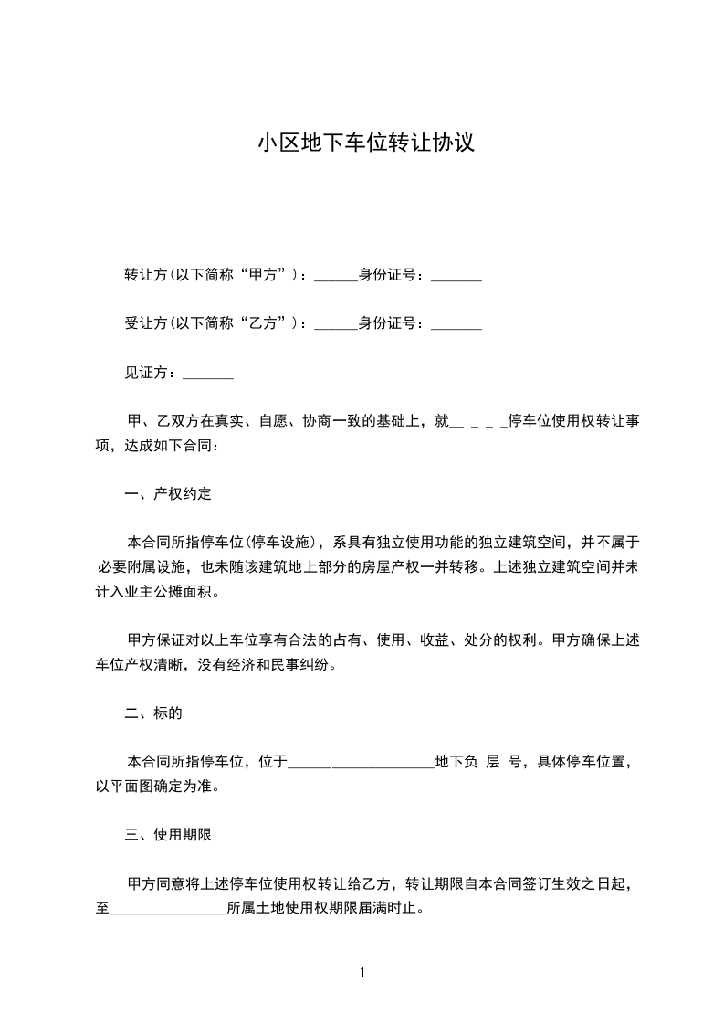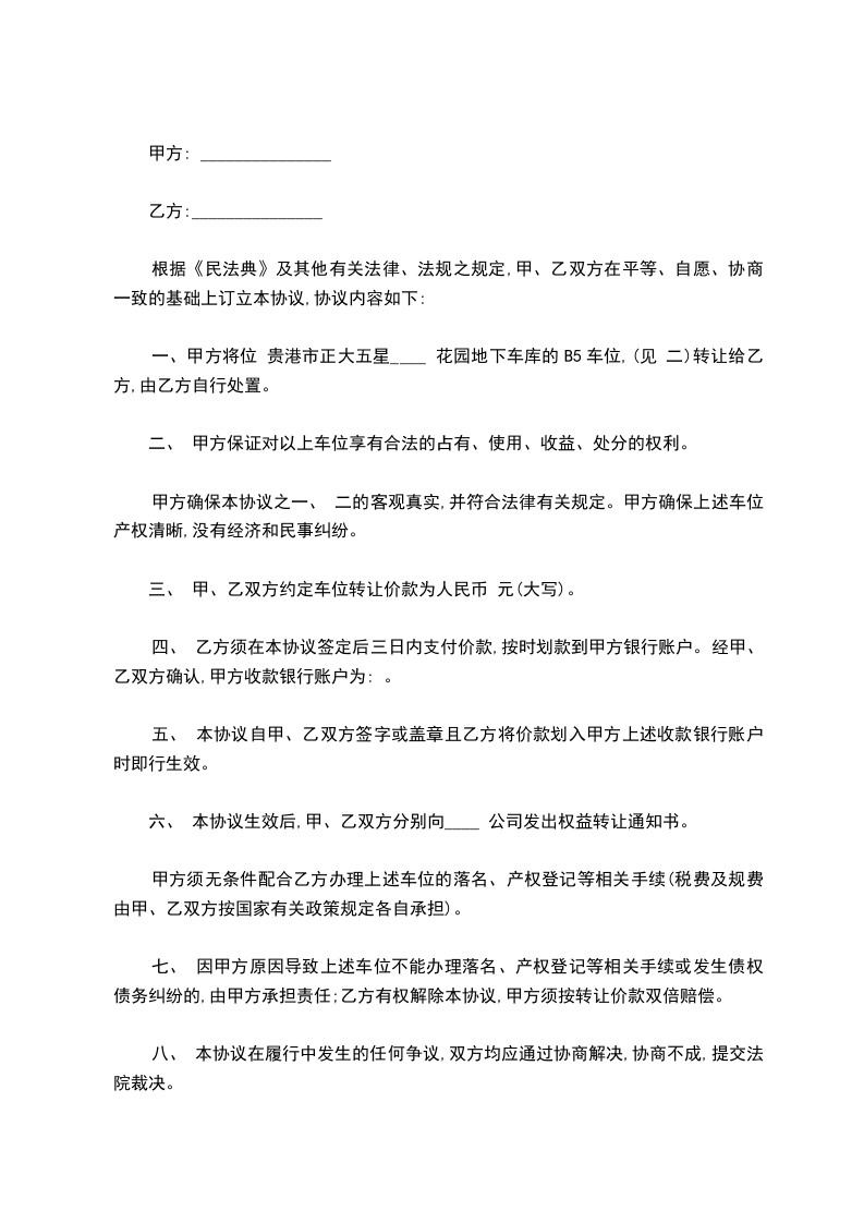 甲、乙双方在真实、自愿、协商一致的基础上,就_____停车位使用权转让事项,达成如下合同: