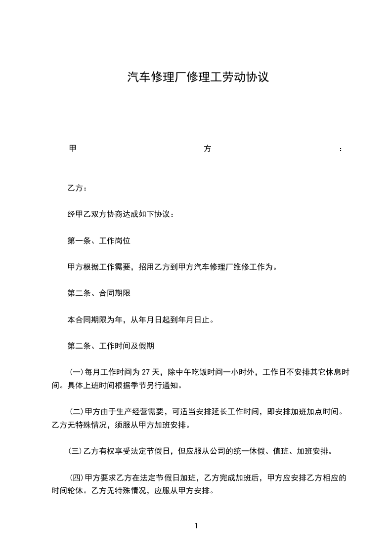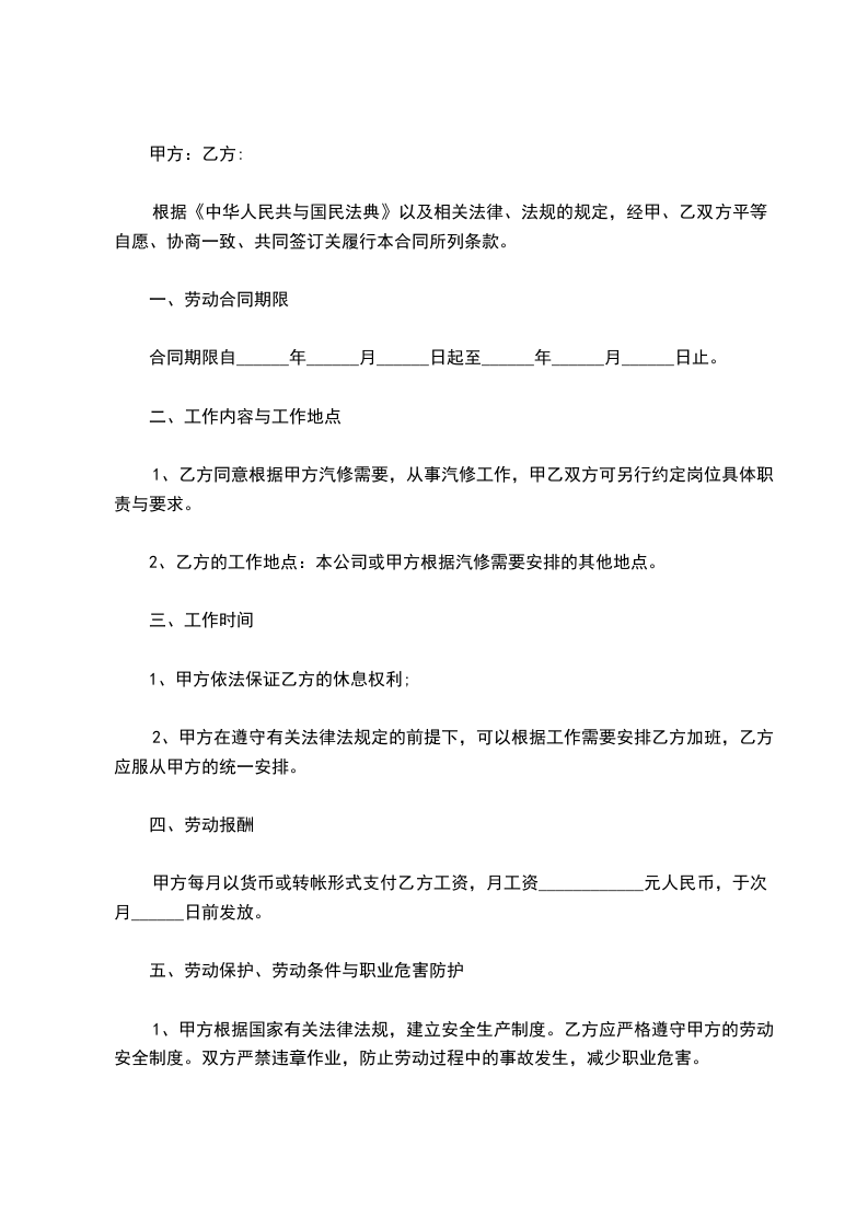 甲方根据工作需要,招用乙方到甲方汽车修理厂维修工作为____________。