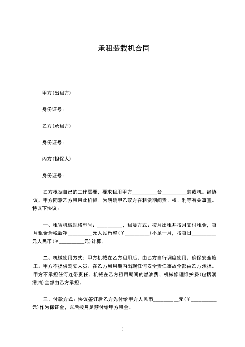 乙方根据自己的工作需要,要求租用甲方__________台__________装载机。经协议,甲方同意乙方租用此机械。为明确甲乙双方在租赁期间责、权、利等有关事宜。特以下协议:
