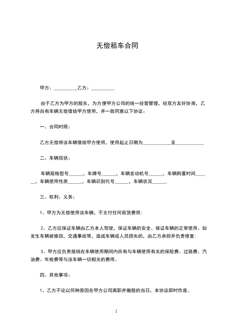 由于乙方为甲方的股东,为方便甲方公司的统一经营管理,经双方友好协商,乙方将自有车辆无偿借给甲方使用,并一致同意以下协议: