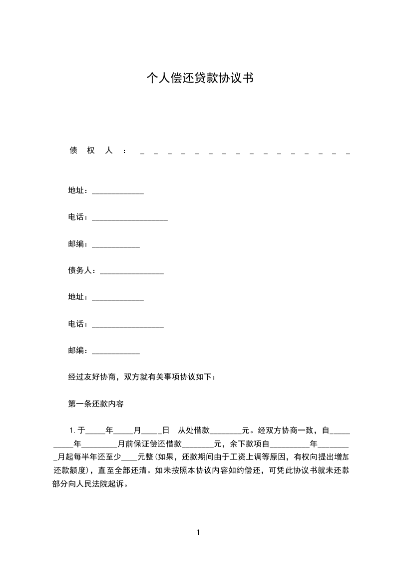 1.于_____年_____月_____日 从处借款________元。经双方协商一致,自__________年_________月前保证偿还借款________元,余下款项自__________年_________月起每半年还至少____元整(如果,还款期间由于工资上调等原因,有权向提出增加还款额度),直至全部还清。如未按照本协议内容如约偿还,可凭此协议书就未还款部分向人民法院起诉。