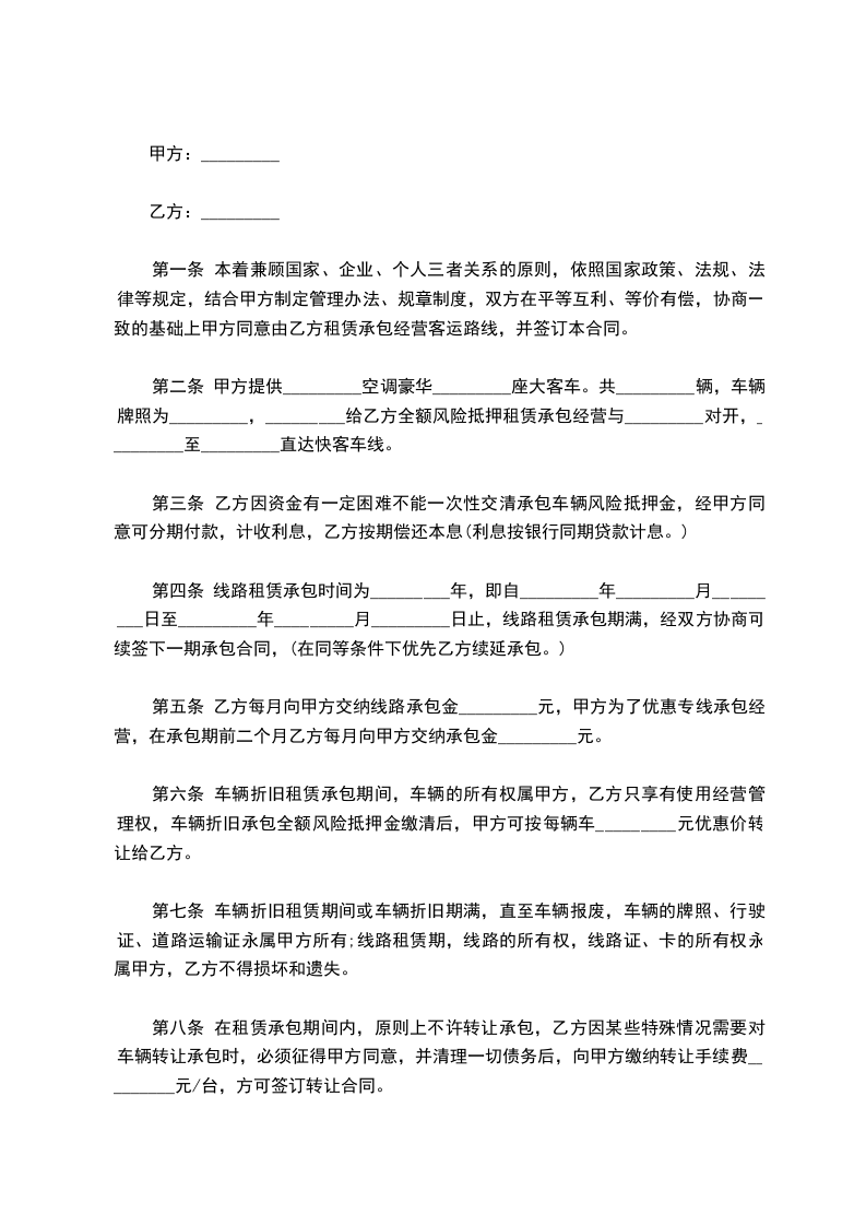 第二条 甲方提供_________空调豪华_________座大客车。共_________辆,车辆牌照为_________,_________给乙方全额风险抵押租赁承包经营与_________对开,_________至_________直达快客车线。