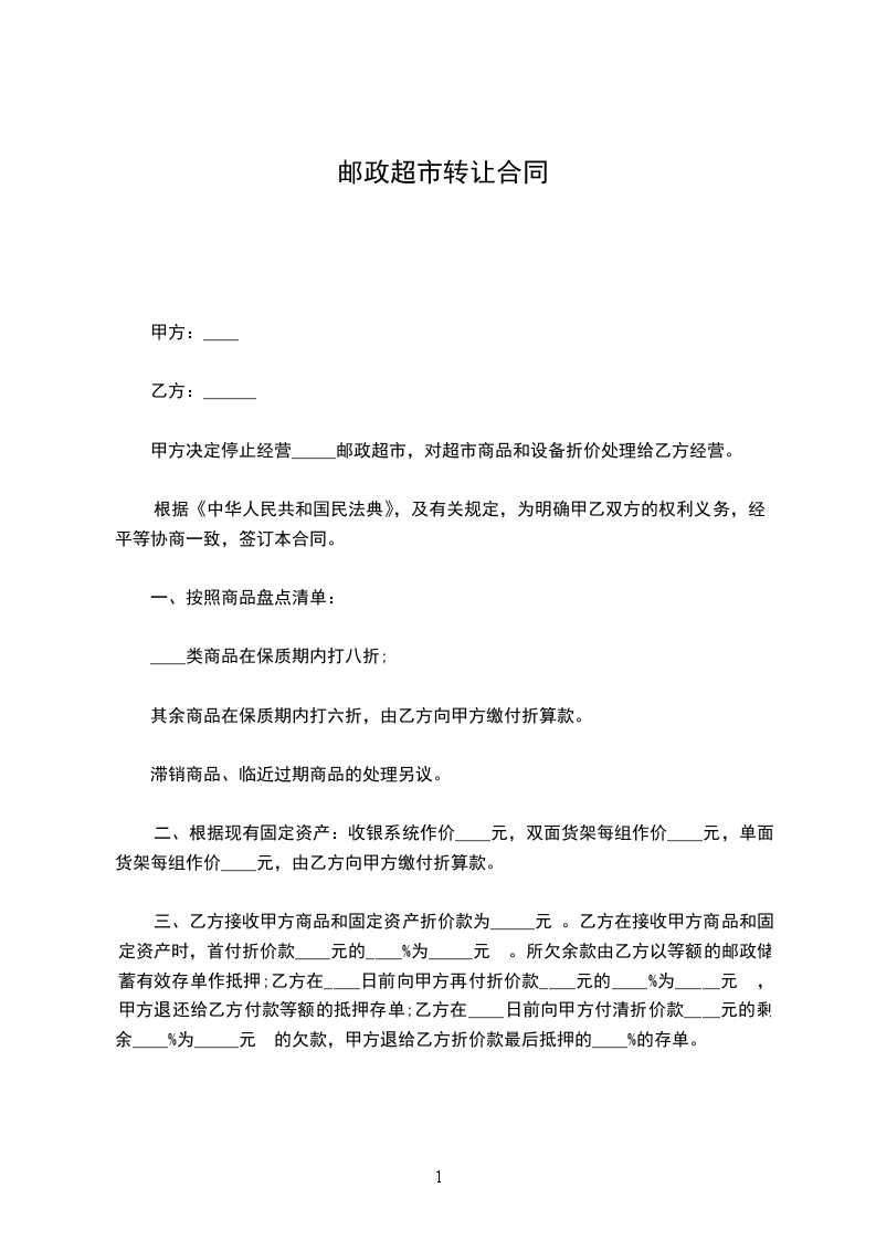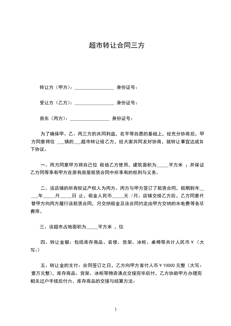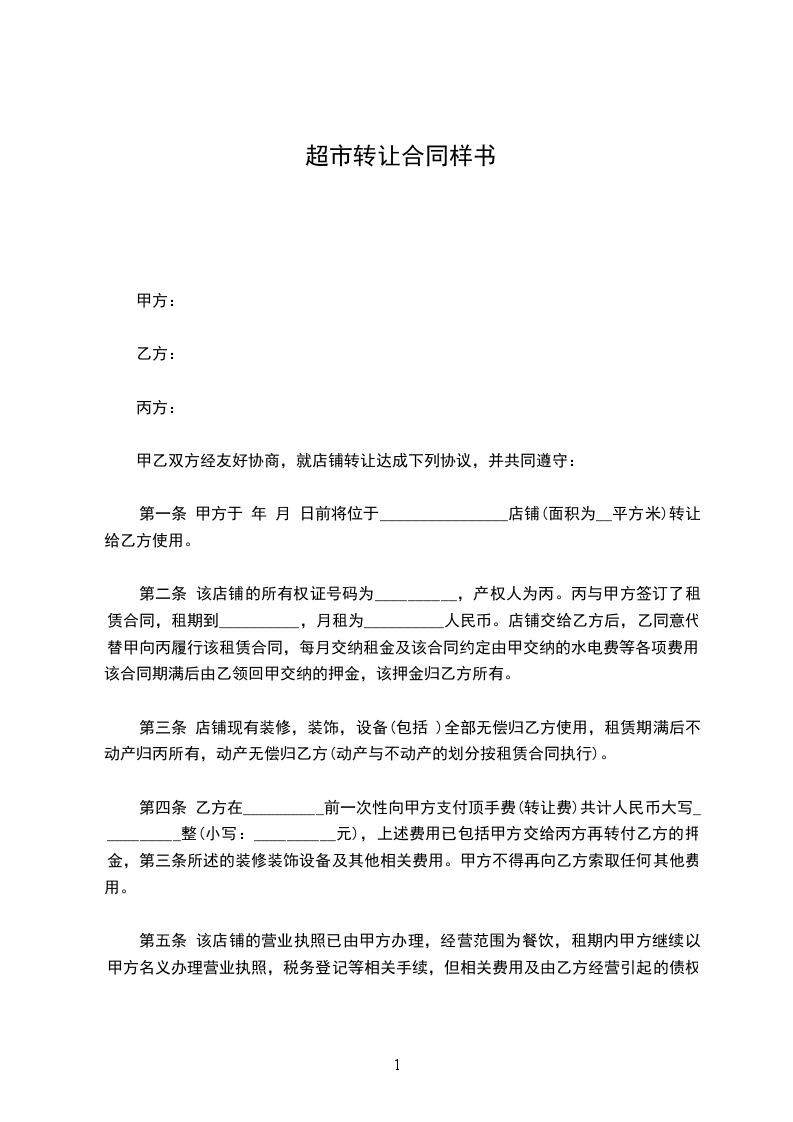 第一条 甲方于 年 月 日前将位于________________店铺(面积为__平方米)转让给乙方使用。
