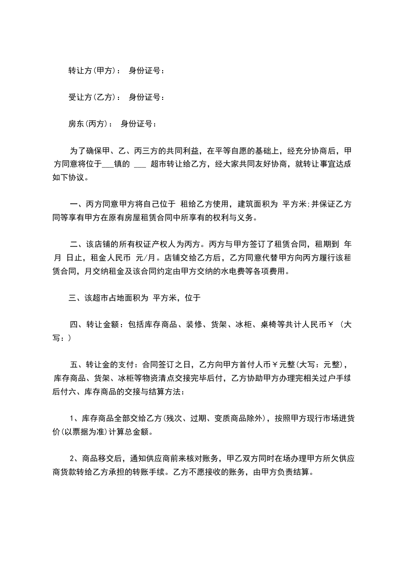 第二条 该店铺的所有权证号码为__________,产权人为丙。丙与甲方签订了租赁合同,租期到__________,月租为__________人民币。店铺交给乙方后,乙同意代替甲向丙履行该租赁合同,每月交纳租金及该合同约定由甲交纳的水电费等各项费用,该合同期满后由乙领回甲交纳的押金,该押金归乙方所有。