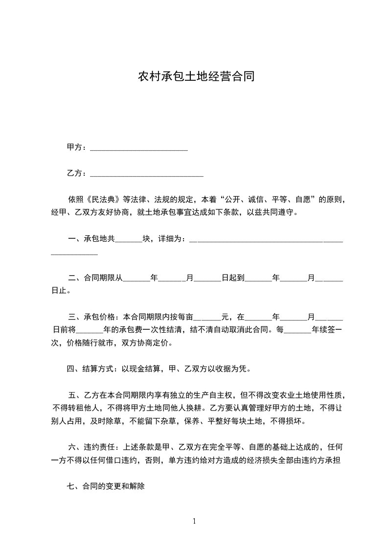 依照《民法典》等法律、法规的规定,本着“公开、诚信、平等、自愿”的原则,经甲、乙双方友好协商,就土地承包事宜达成如下条款,以兹共同遵守。