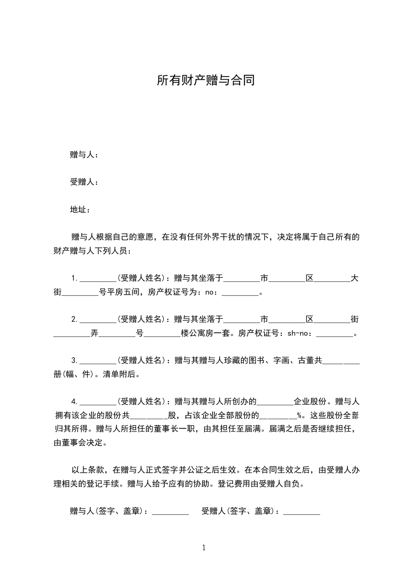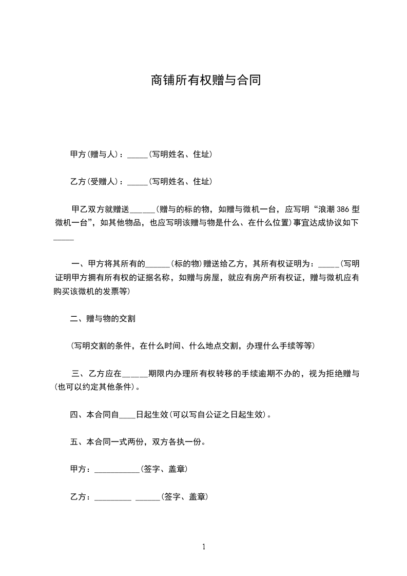 一、甲方将其所有的________(标的物)赠送给乙方,其所有权证明为:(写明证明甲方拥有所有权的证据名称,如赠与房屋,就应有房产所有权证,赠与微机应有购买该微机的发票等)