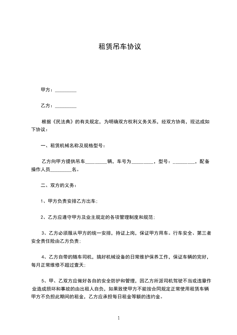 五、严格执行安全操作规程,不能违章作业,严禁超负荷起吊。乙方机械进场后,甲方须负责每天工作之余该吊车的保卫工作,以免发生机械意外,如因甲方原因造成乙方机械损坏或丢失(包括车上零部件),甲方要负责赔偿。
