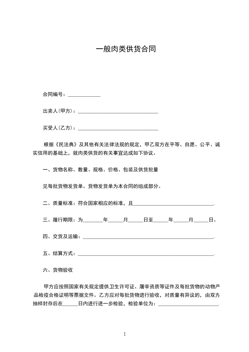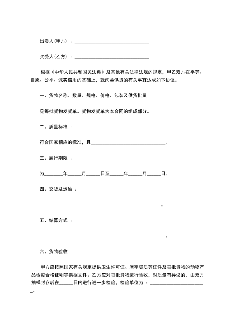 根据《民法典》及其他有关法律法规的规定,甲乙双方在平等、自愿、公平、诚实信用的基础上,就肉类供货的有关事宜达成如下协议。