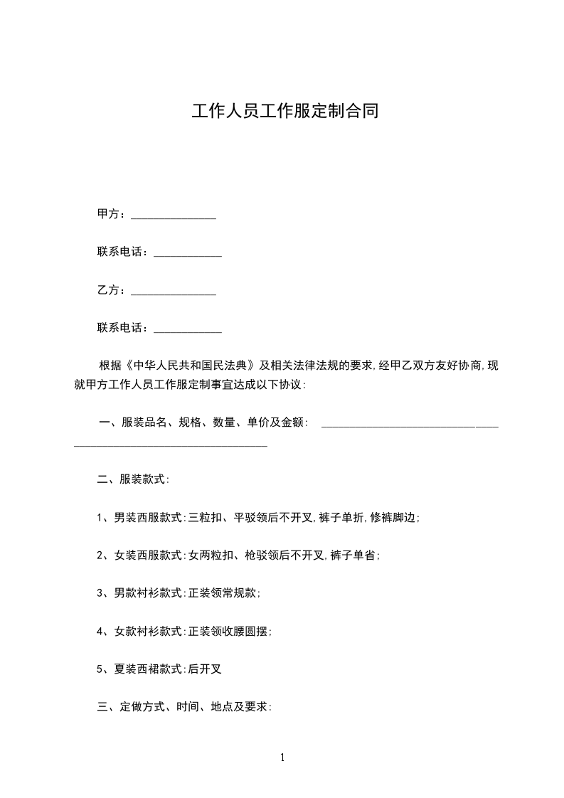 根据《中华人民共和国民法典》及相关法律法规的要求,经甲乙双方友好协商,现就甲方工作人员工作服定制事宜达成以下协议: