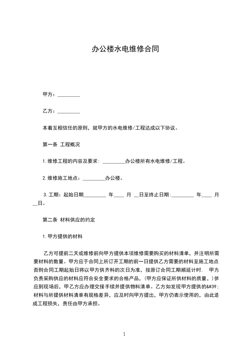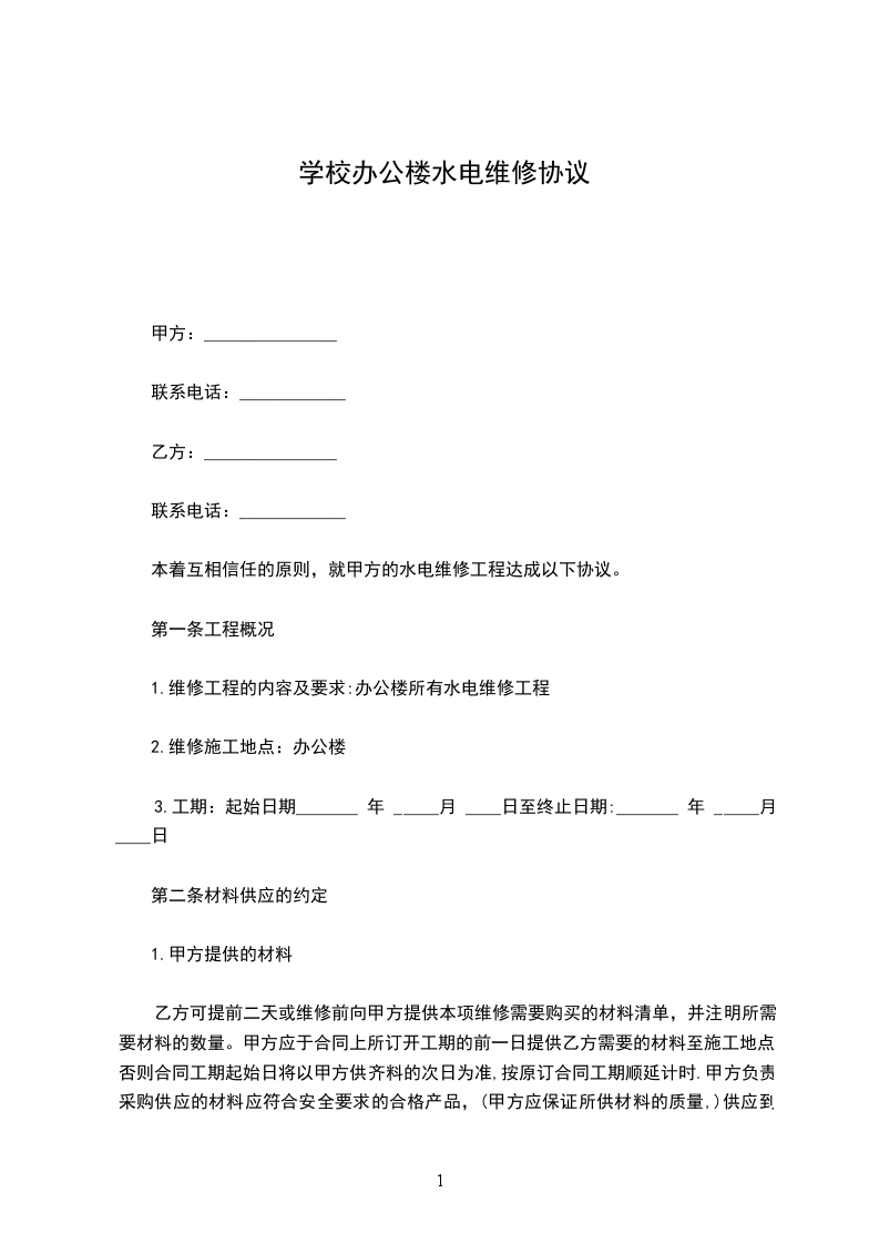 本着互相信任的原则,就甲方的水电维修工程达成以下协议。