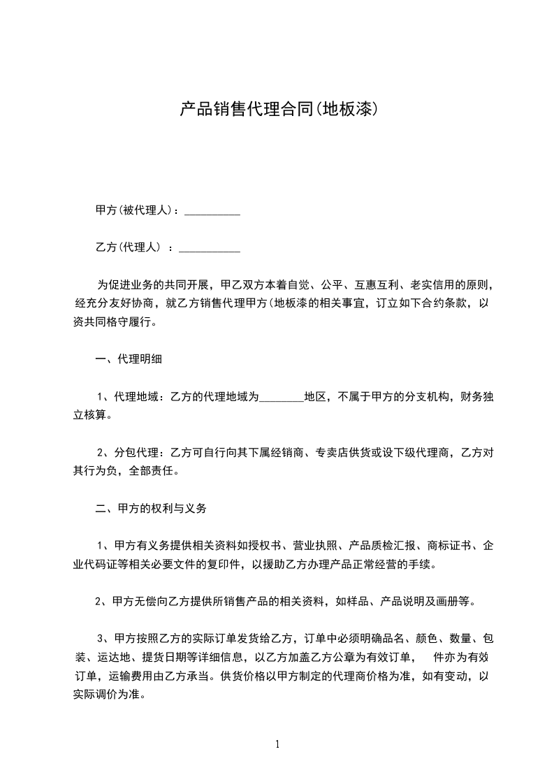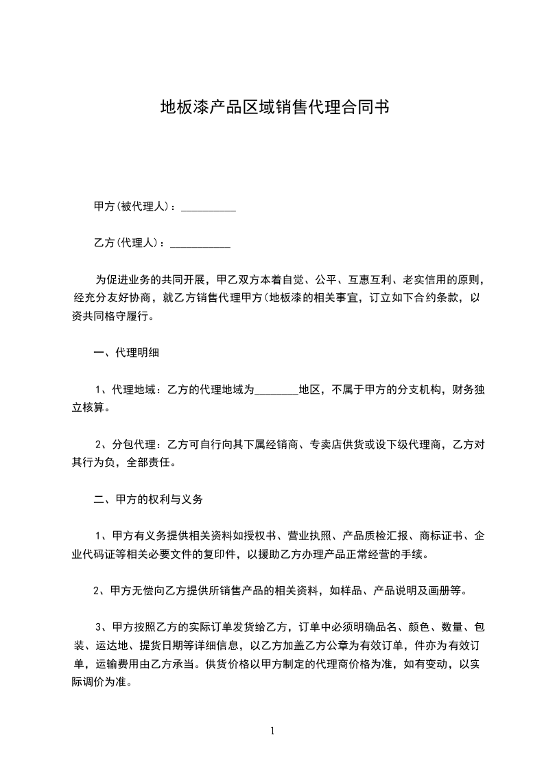 为促进业务的共同开展,甲乙双方本着自觉、公平、互惠互利、老实信用的原则,经充分友好协商,就乙方销售代理甲方(地板漆的相关事宜,订立如下合约条款,以资共同格守履行。