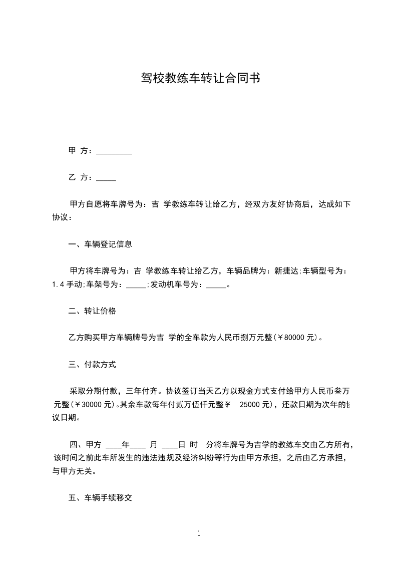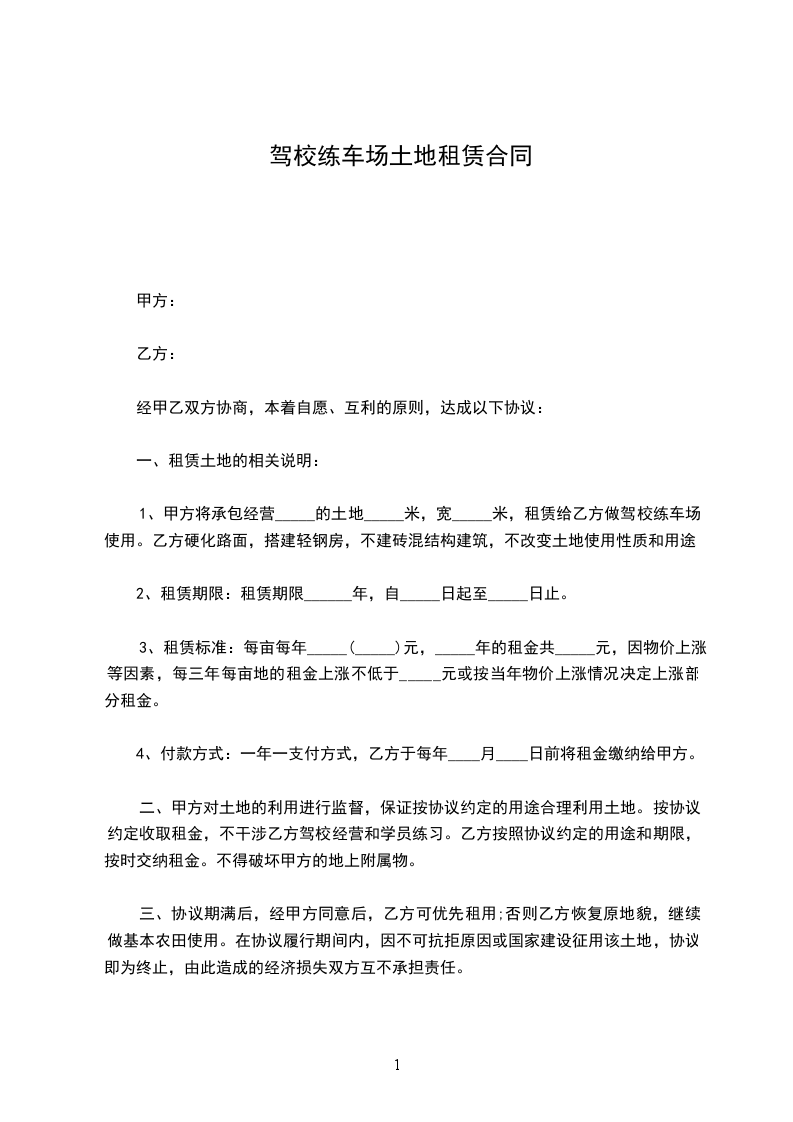 1、甲方将承包经营_______村_______组的土地_______米,宽_______米),租赁给乙方做驾校练车场使用。乙方硬化路面,搭建轻钢房,不建砖混结构建筑,不改变土地使用性质和用途。