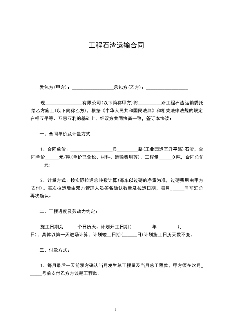 1、合同单价:__________________县_________路(工业园运至升平路)石渣,合同单价______元/吨(单价已含税、材料、运输费用等),工程量______0吨,合同总价______元;