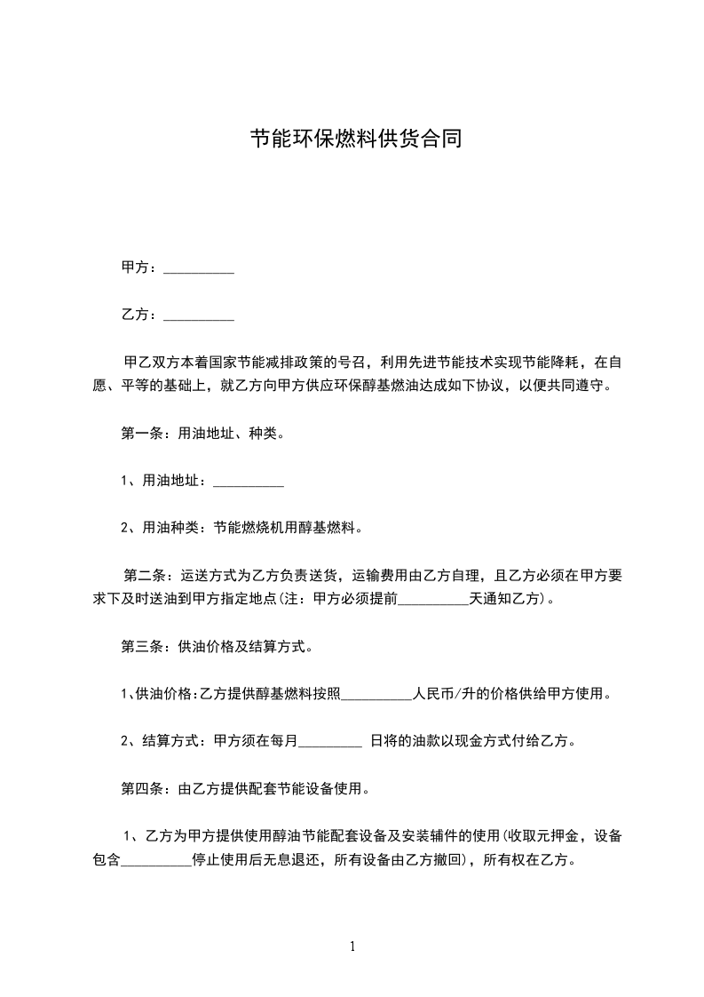 甲乙双方本着国家节能减排政策的号召,利用先进节能技术实现节能降耗,在自愿、平等的基础上,就乙方向甲方供应环保醇基燃油达成如下协议,以便共同遵守。