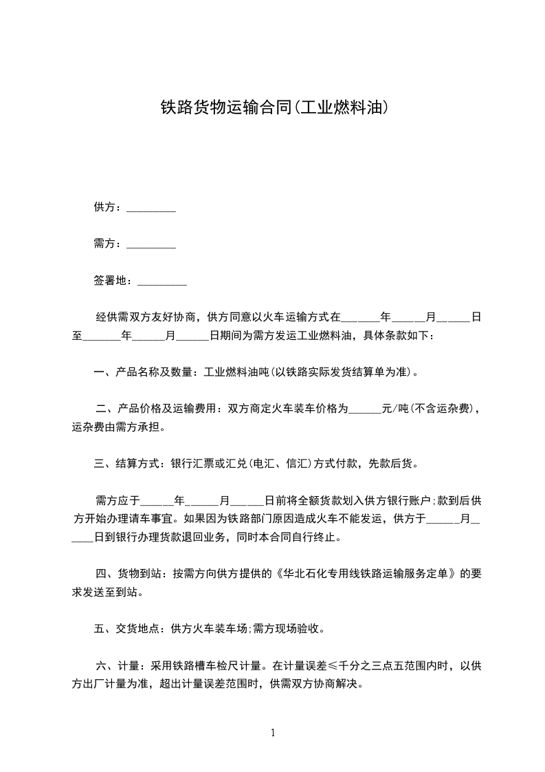 经供需双方友好协商,供方同意以火车运输方式在_______年______月______日至_______年______月______日期间为需方发运工业燃料油,具体条款如下: