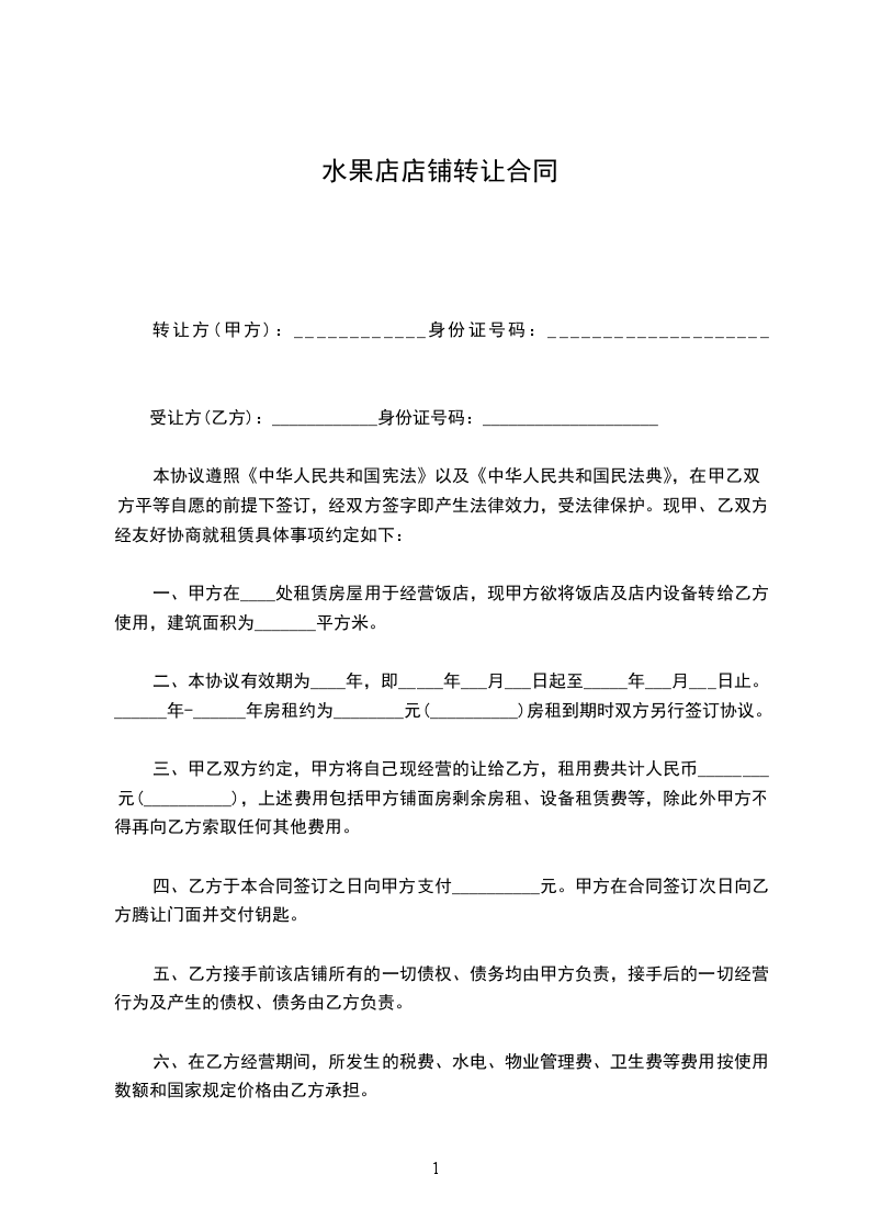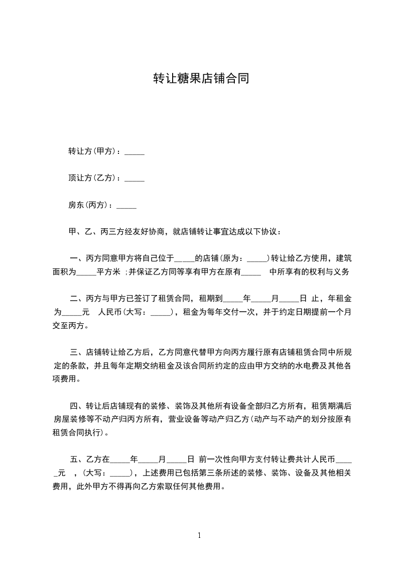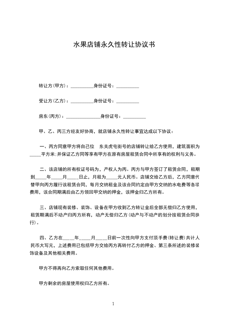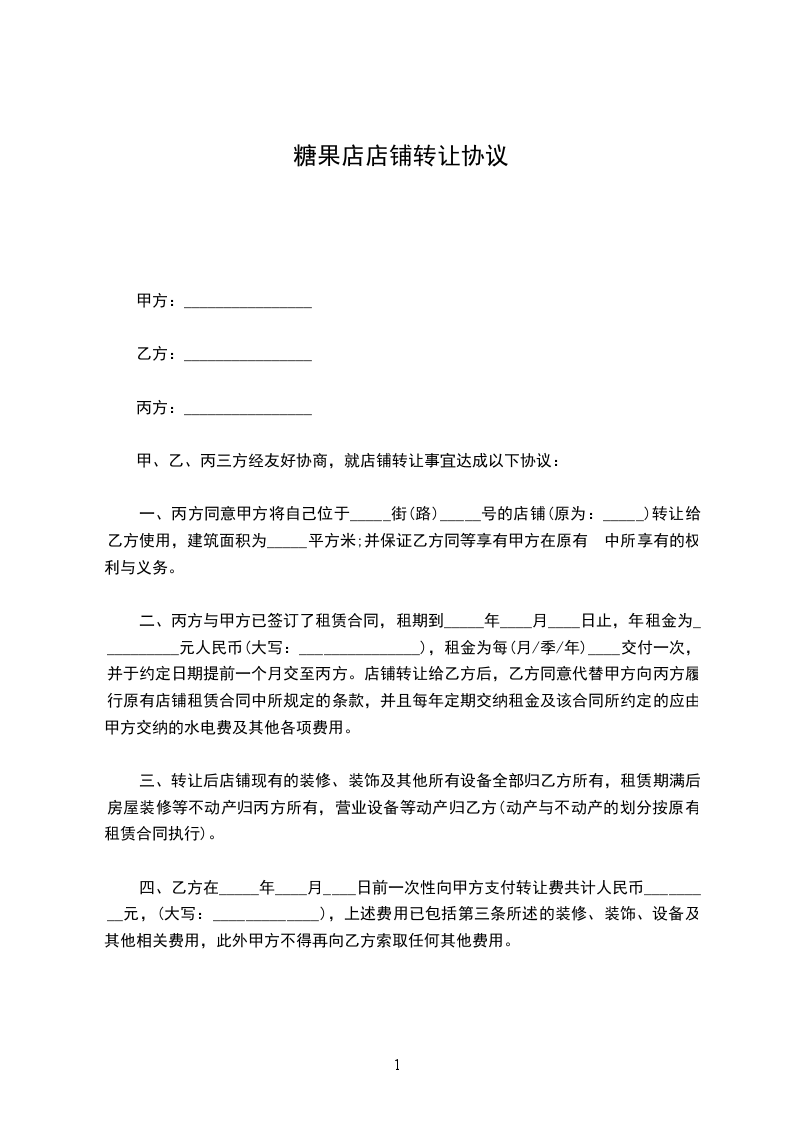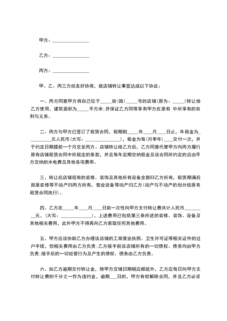 一、丙方同意甲方将自己位于_____街(路)_____号的店铺(原为:_____)转让给乙方使用,建筑面积为_____平方米;并保证乙方同等享有甲方在原有 中所享有的权利与义务。