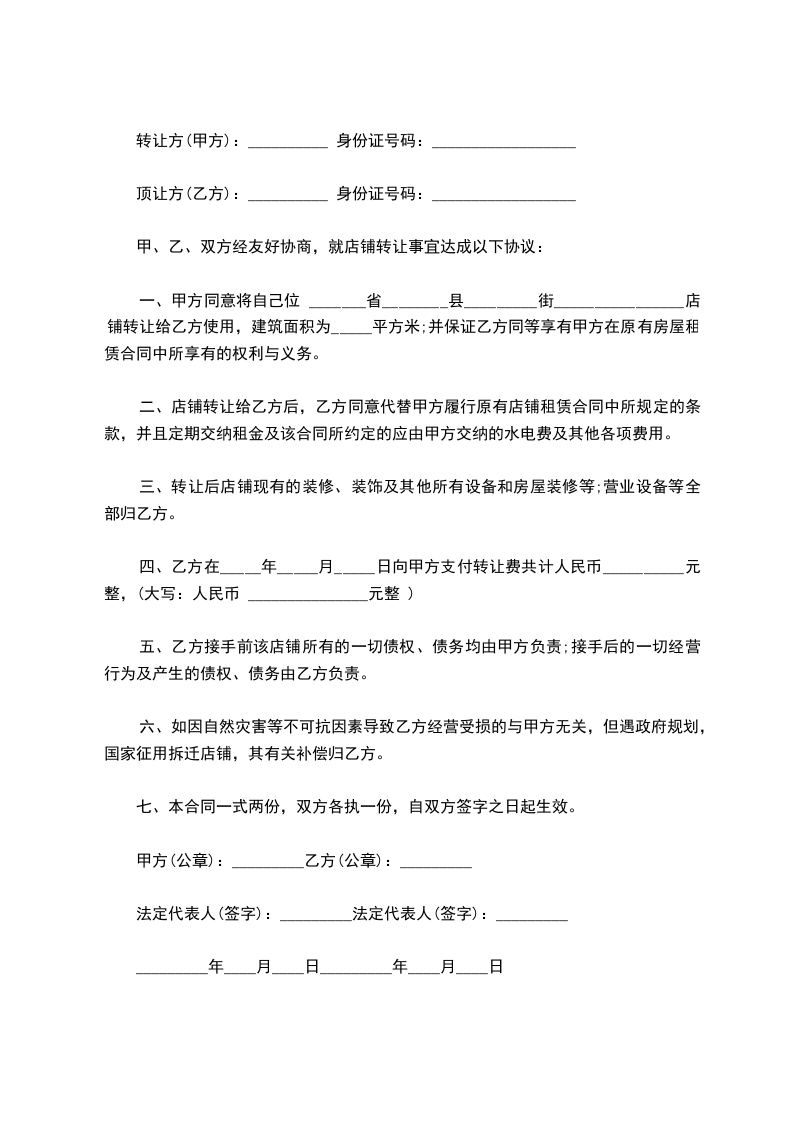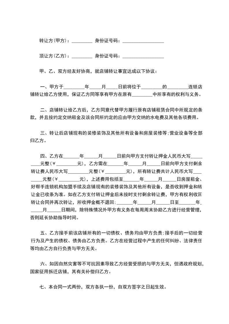 五、甲方应该协助乙方办理该店铺的工商营业执照、卫生许可证等相关证件的.过户手续,但相关费用由乙方负责;乙方接手前该店铺所有的一切债权、债务均由甲方负责;接手后的一切经营行为及产生的债权、债务由乙方负责。