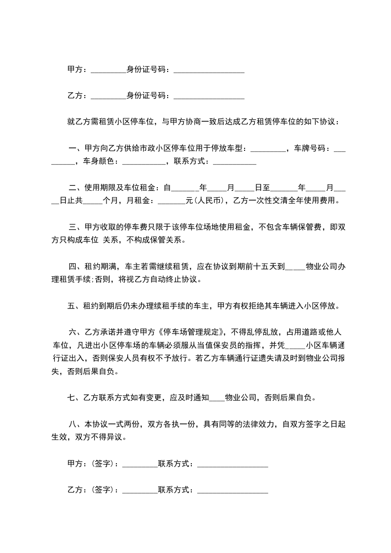一、甲方向乙方供给市政小区停车位用于停放车型:_________,车牌号码:_________,车身颜色:___________,联系方式:___________