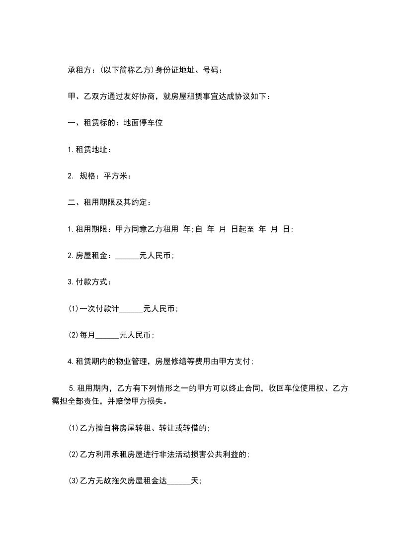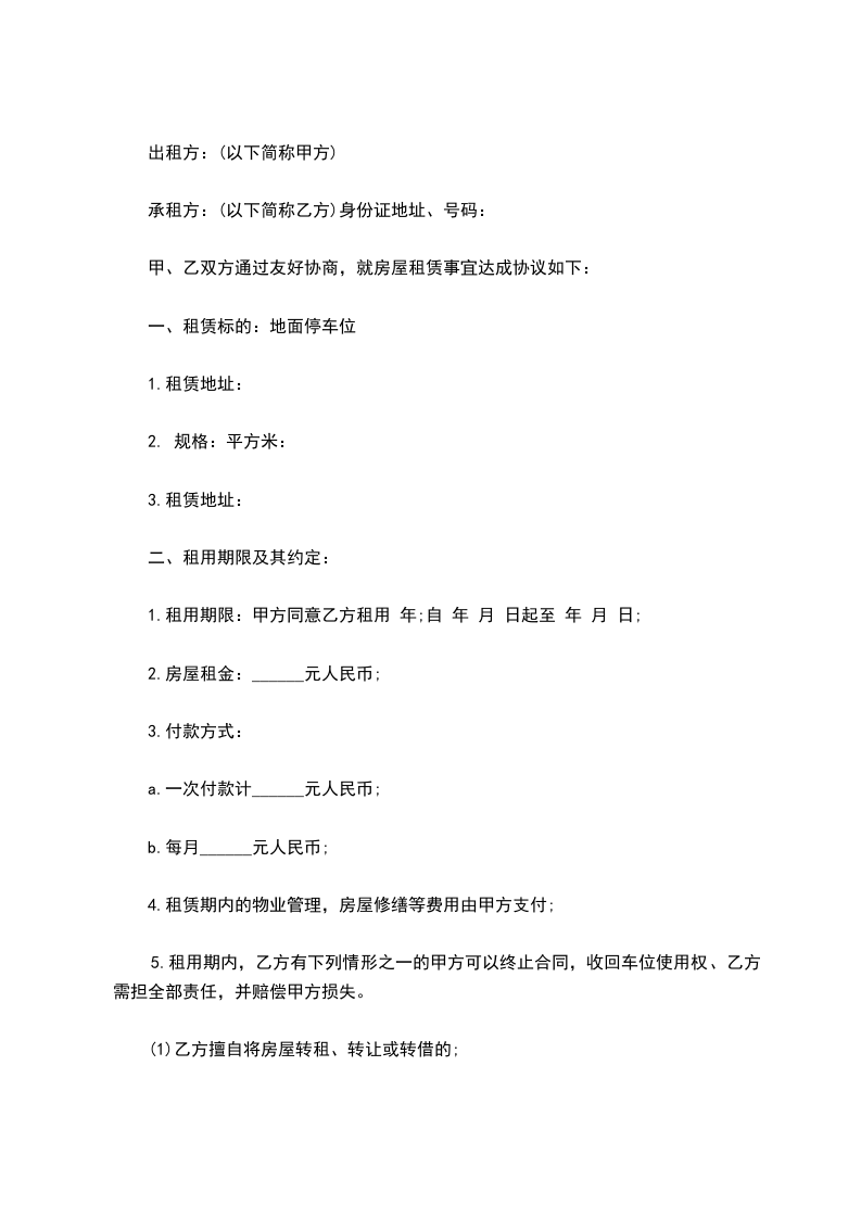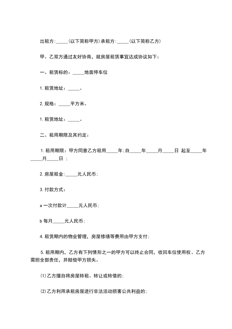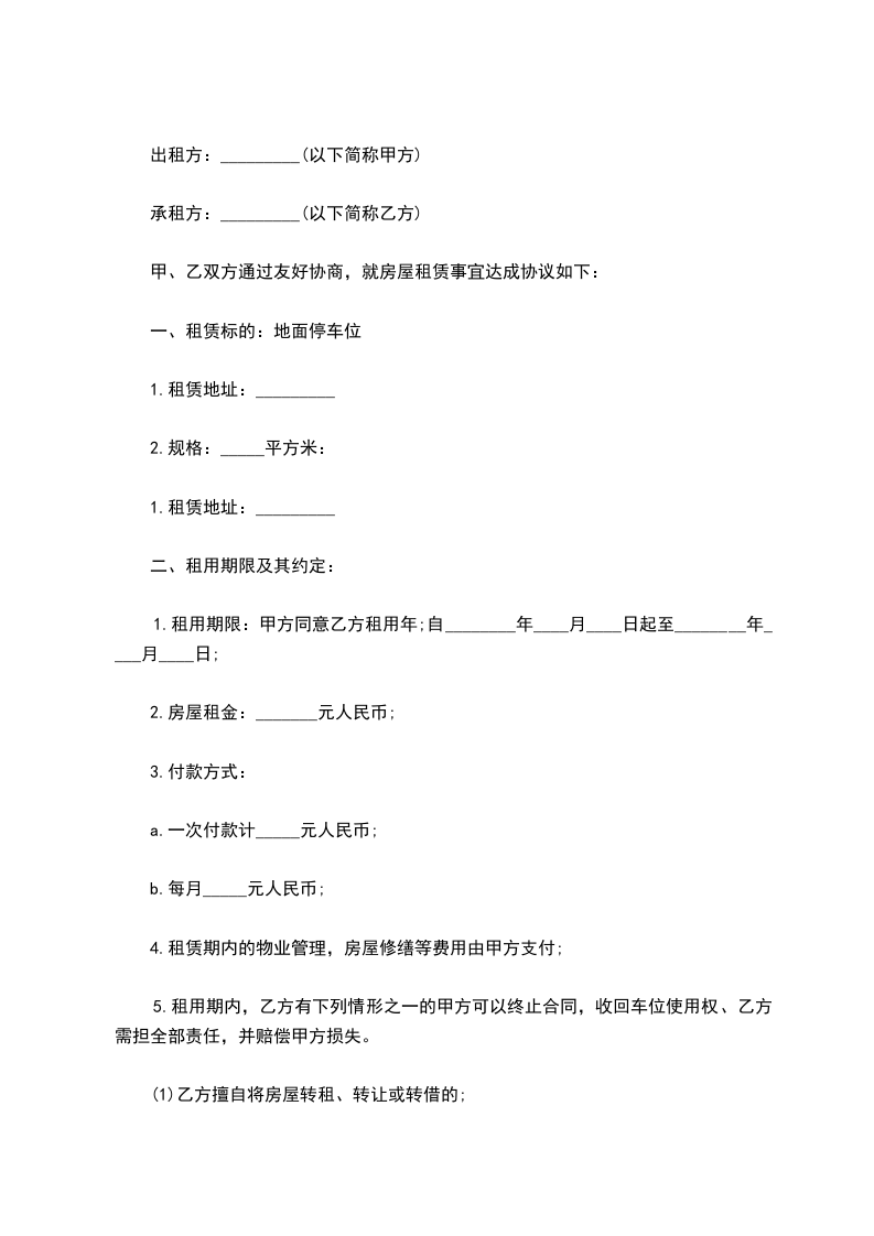 5.租用期内,乙方有下列情形之一的甲方可以终止合同,收回车位使用权、乙方需担全部责任,并赔偿甲方损失。