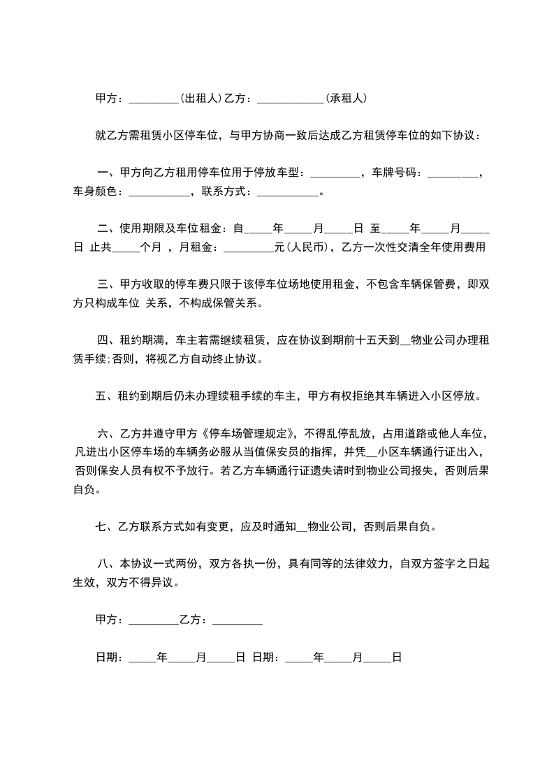 一、甲方向乙方租用停车位用于停放车型:_________,车牌号码:_________,车身颜色:___________,联系方式:___________。
