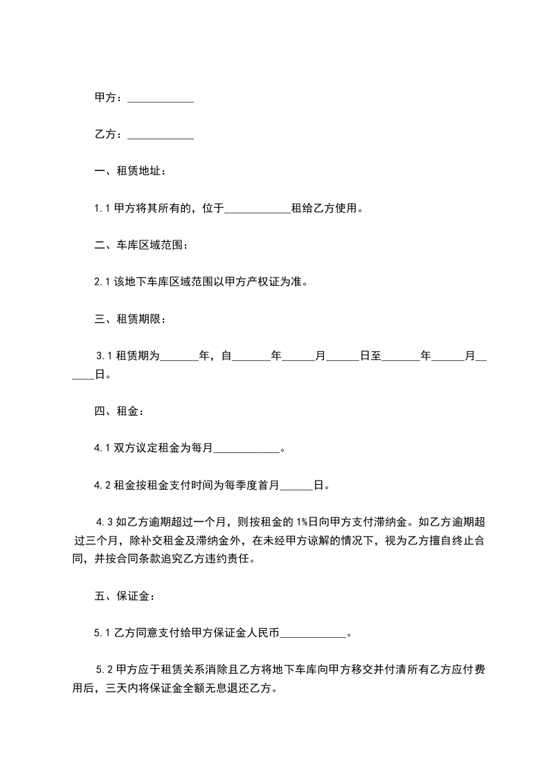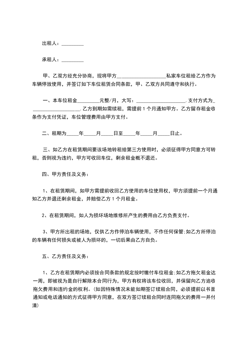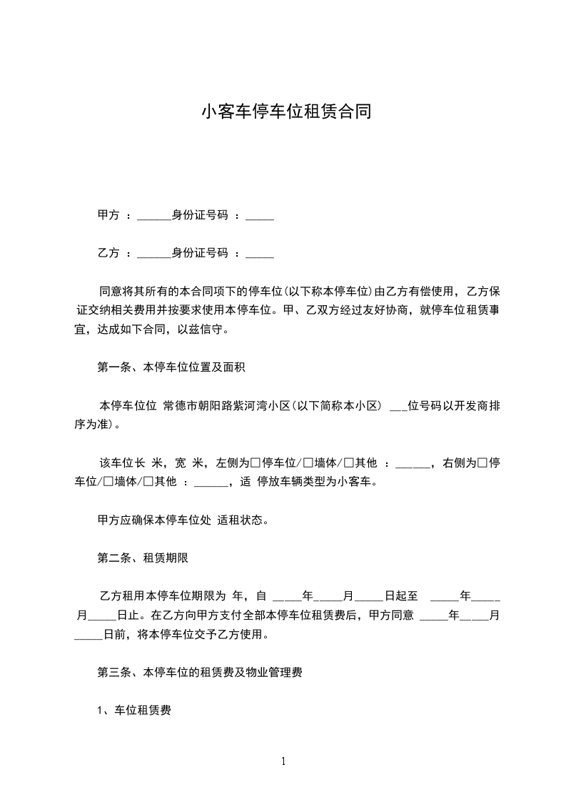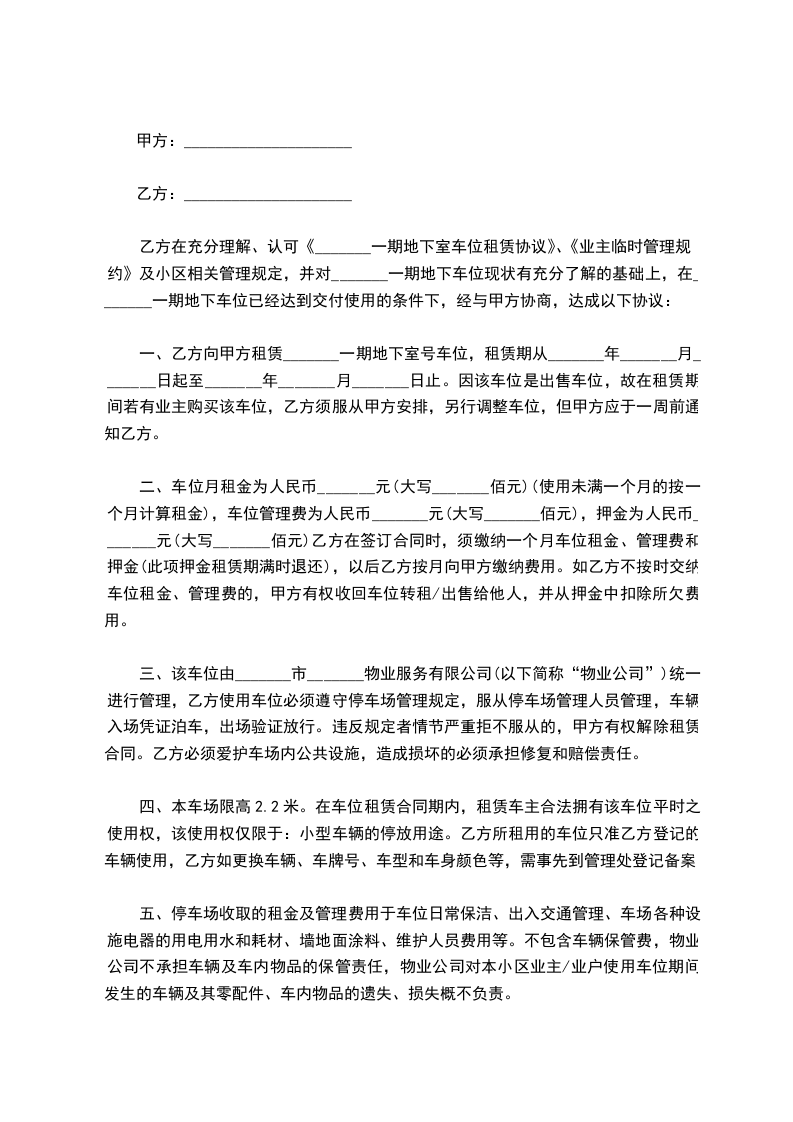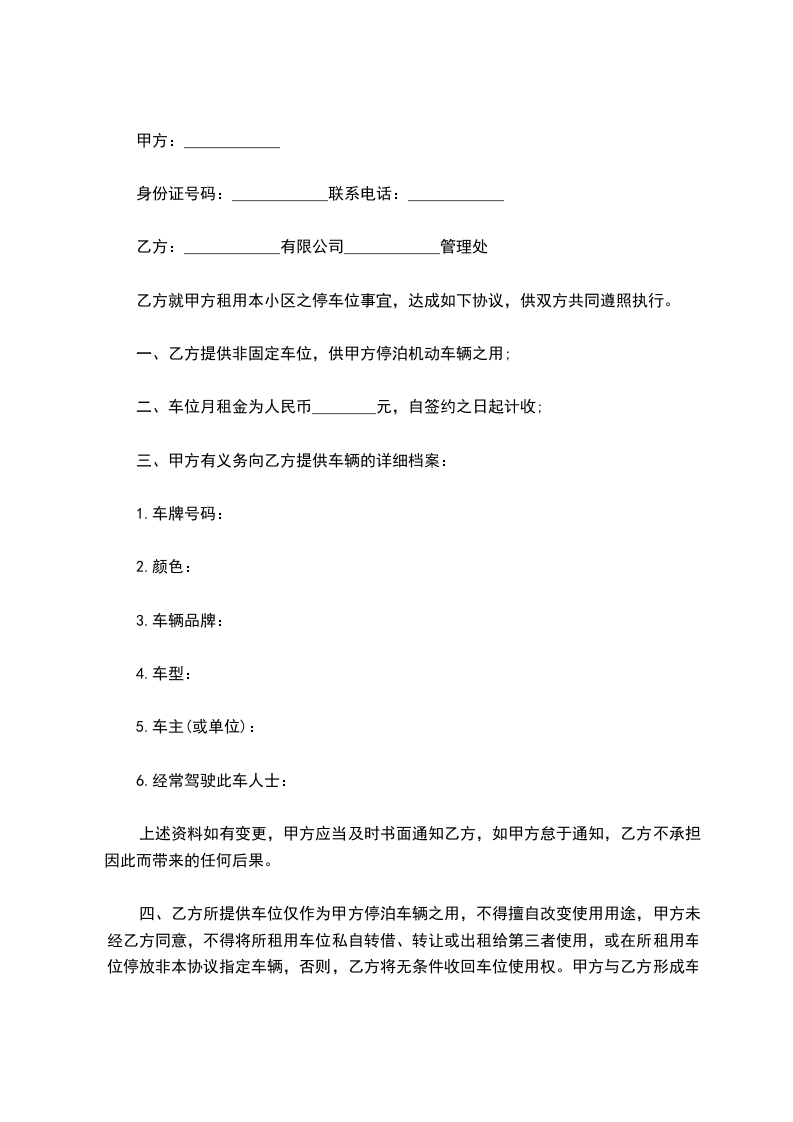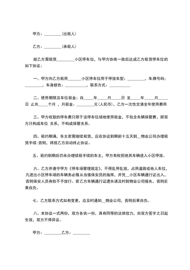 一、甲方向乙方租用_______小区停车位用于停放车型:_________,车牌号码:_________,车身颜色:___________,联系方式:___________