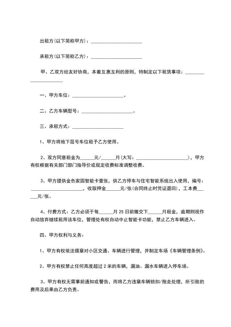4、付费方式:乙方必须于每______月25日前缴交下______月租金,逾期则视作自动放弃继续租用该车位,管理处有权自动中止智能卡功能,禁止乙方车辆进入。