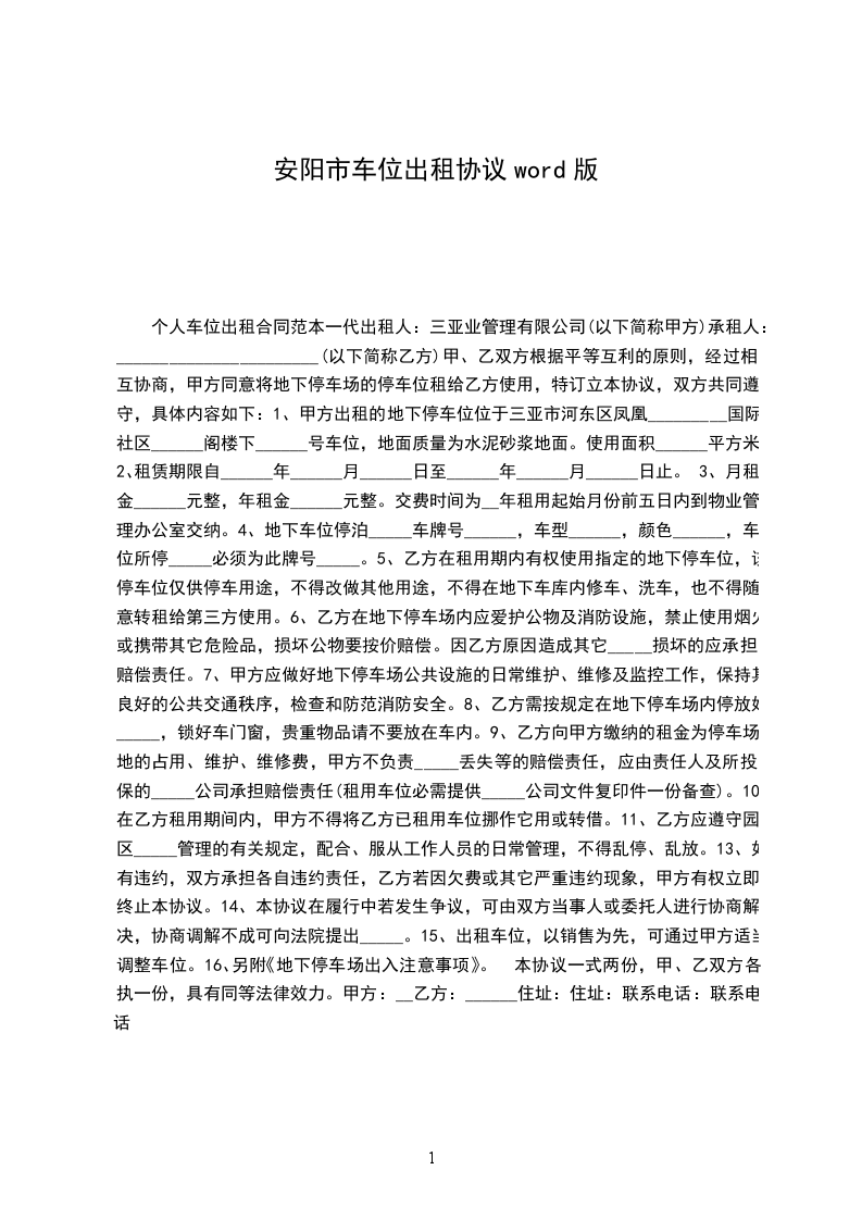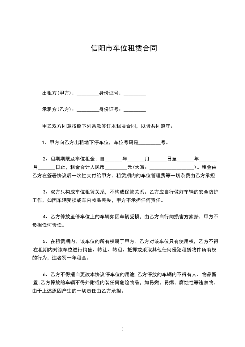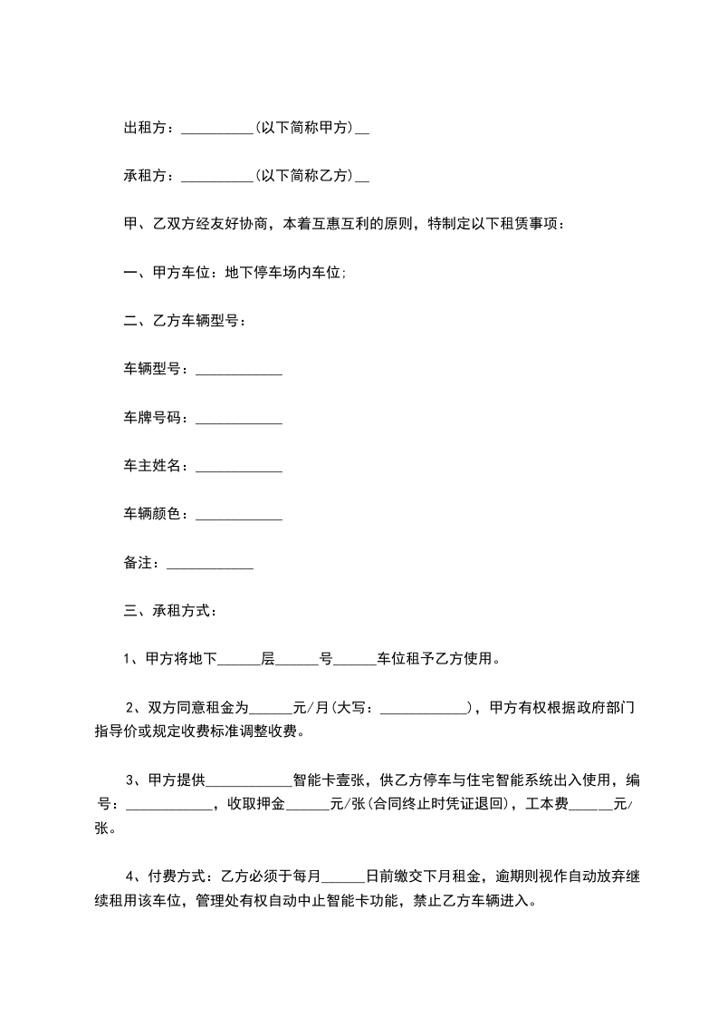 1、甲方向乙方出租地下停车位,车位号码是_________号。