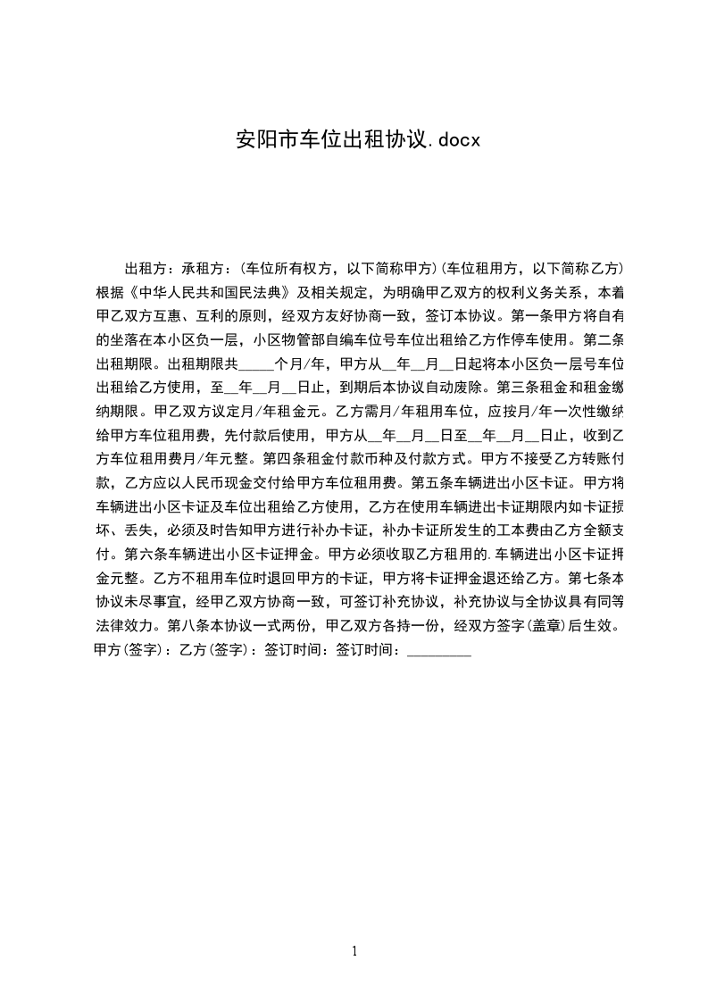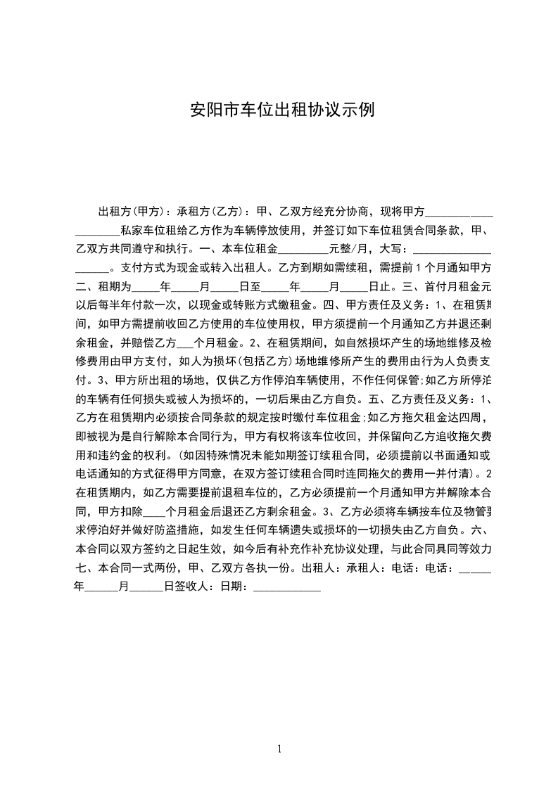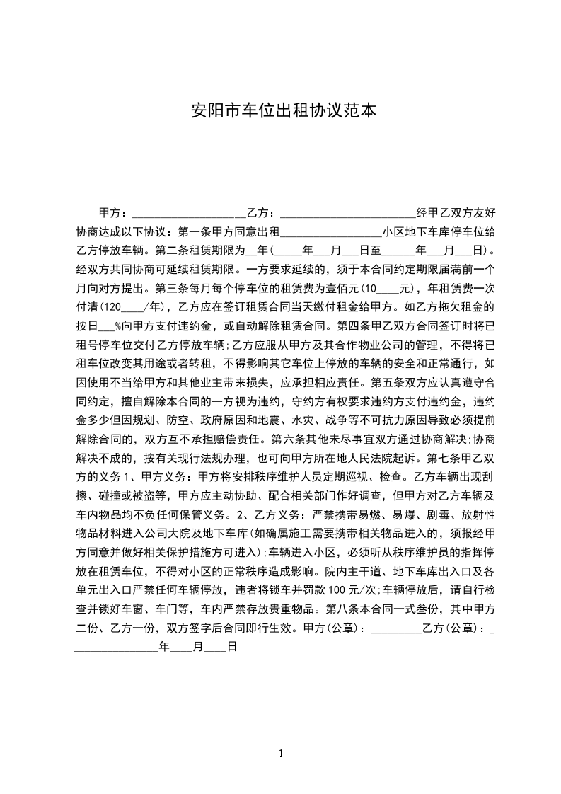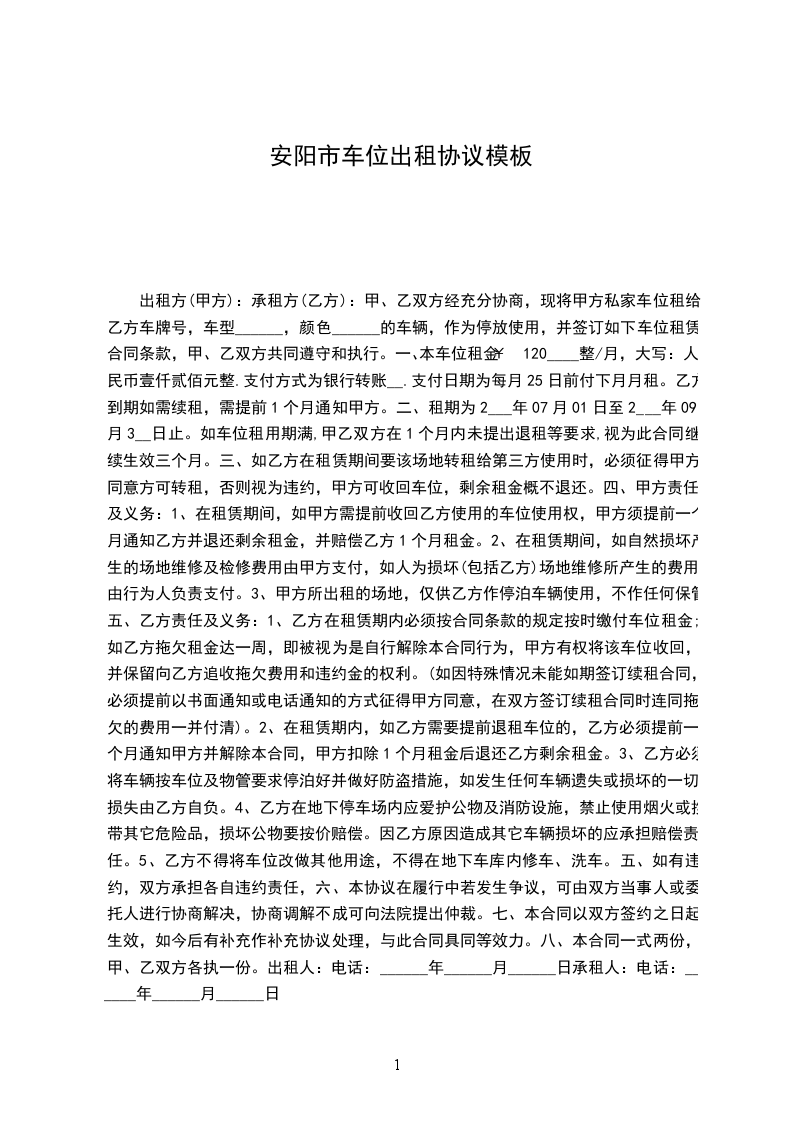 1、甲方向乙方出租地下停车位,车位号码是_________号。