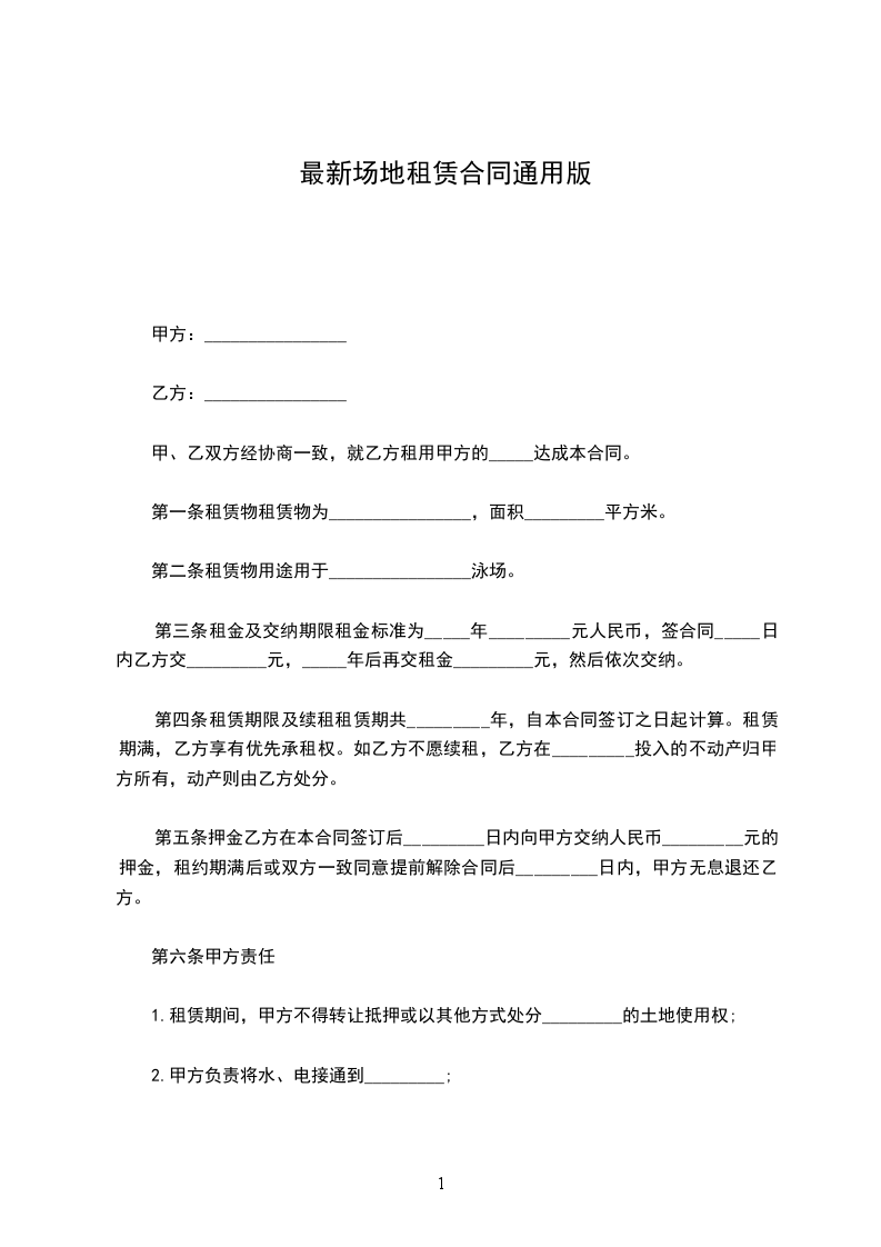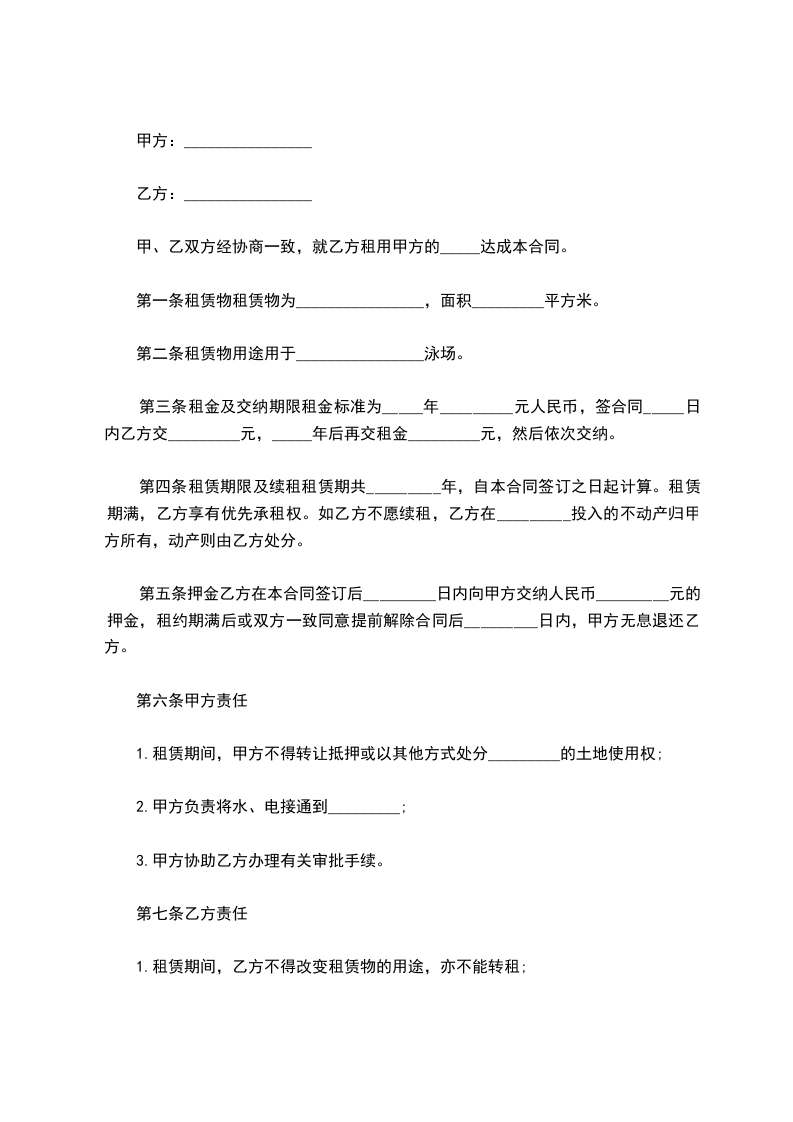 三、付款方式:每年支付当年租金,并于每年的_____月_____日 一次性付清当年租金。在租赁合同期间产生的水电和其他费用(需由甲方负责的)由甲方承担。