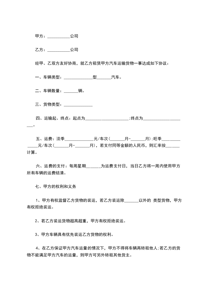 经甲、乙双方友好协商,就乙方租赁甲方汽车运输货物一事达成如下协议: