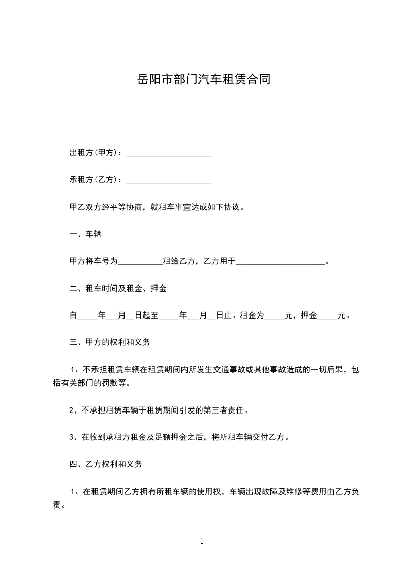 一、出租方根据承租方需要,同意将_______牌汽车_______辆租给承租方使用,经双方协商订立如下条款。