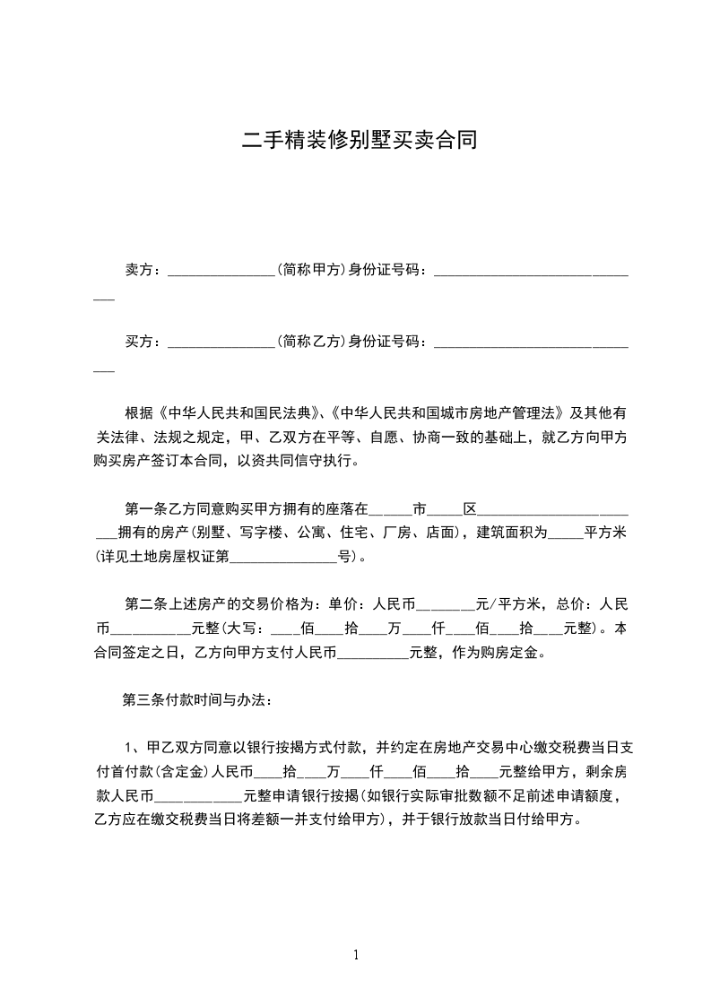 2、甲乙双方同意以一次性付款方式付款,并约定在房地产交易中心缴交税费当日支付首付款(含定金)人民币____拾____万____仟____佰____拾____元整给甲方,剩余房款人民币____________元整于产权交割完毕当日付给甲方。