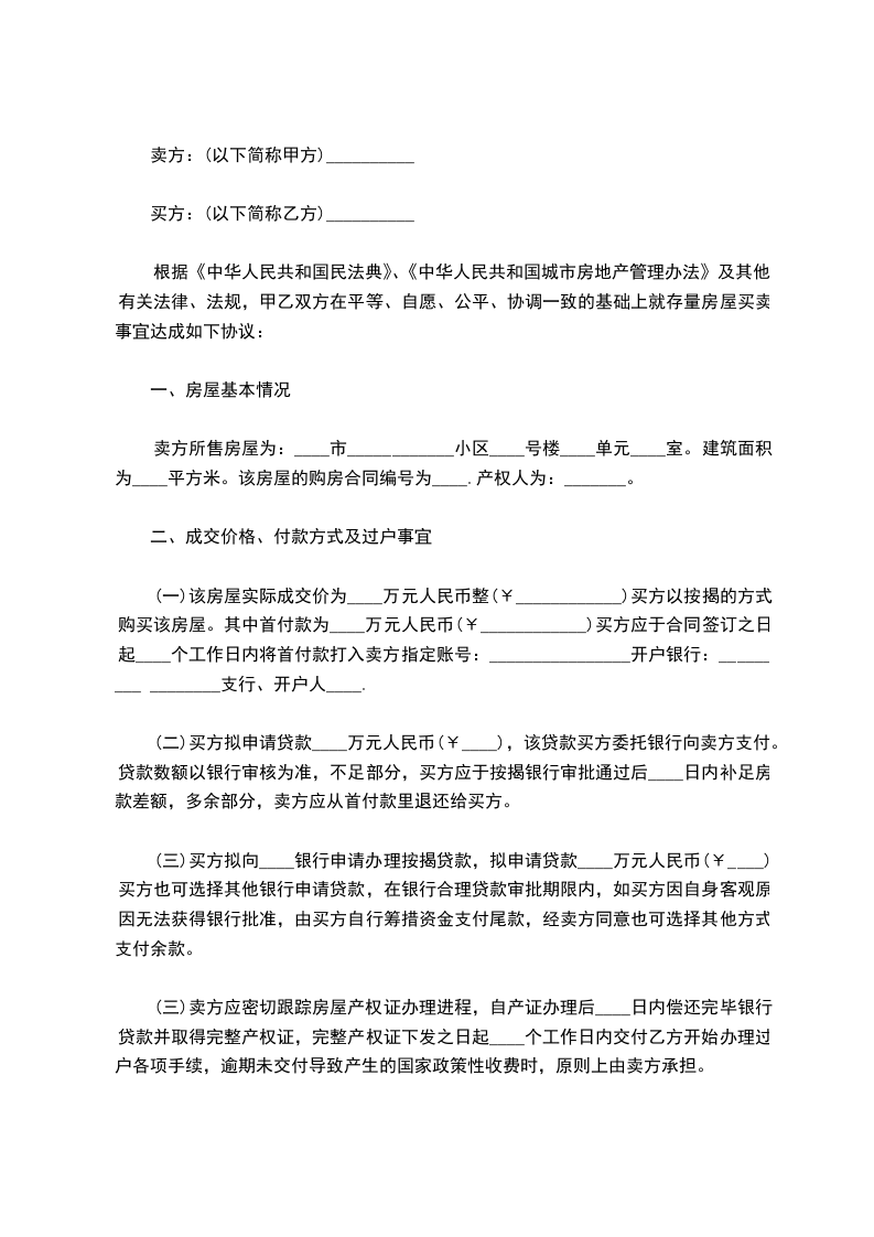 根据《中华人民共和国民法典》、《中华人民共和国城市房地产管理办法》及其他有关法律、法规,甲乙双方在平等、自愿、公平、协调一致的基础上就存量房屋买卖事宜达成如下协议:
