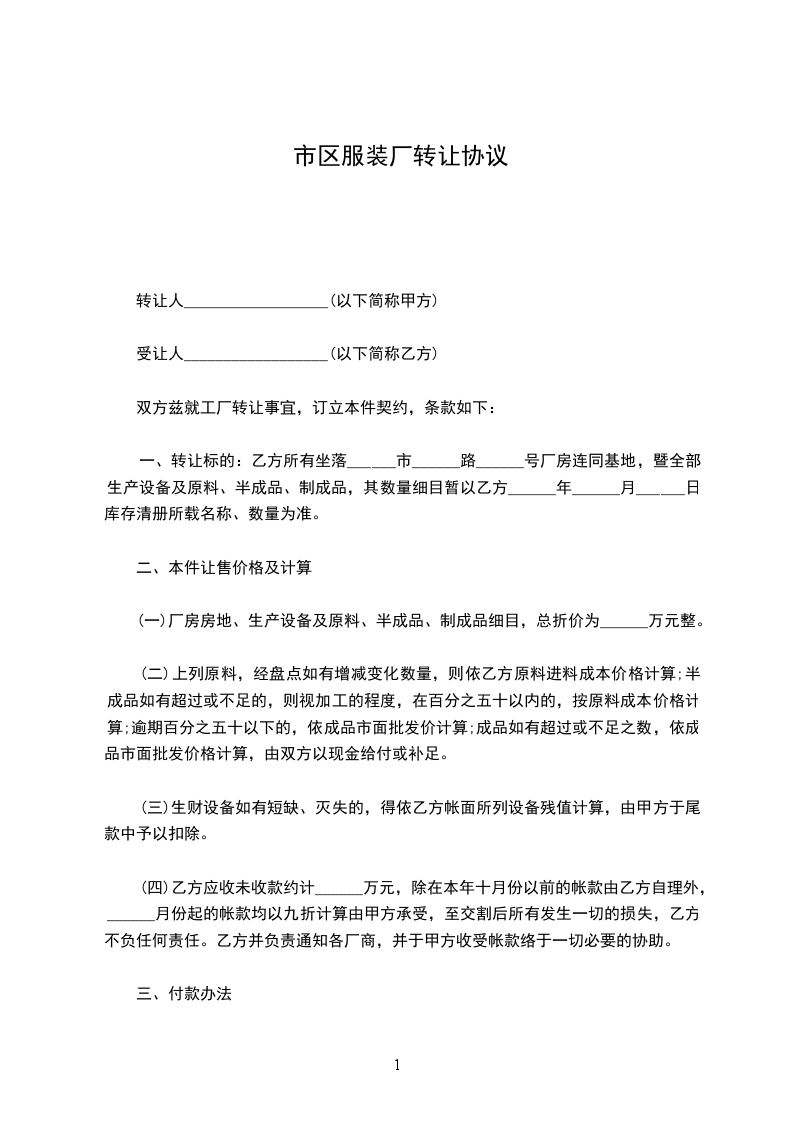(一)前条第一项的价格,于本契约成立同时,甲方交付乙方______万元,余款______万元,原料、成品、厂房房地、生产设备点交清楚同时,一次付清。
