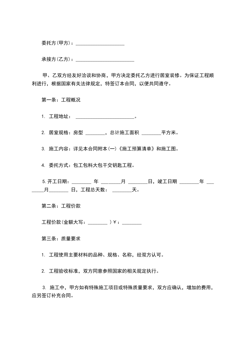 甲、乙双方经友好洽谈和协商,甲方决定委托乙方进行居室装修。为保证工程顺利进行,根据国家有关法律规定,特签订本合同,以便共同遵守。