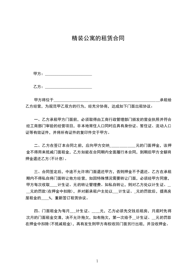三、合同签定后,中途不允许将门面退还甲方,否则押金不予退还。乙方在承租期内不得私自将门面转让他方经营,如因特殊情况需要转让门面,必须经甲方同意,甲方每次收取____计生证、元的转让管理费。如私自转让,则对乙方处以计生证、____元的罚款(在押金中扣除),并对新承租户主处以___计生证、_元的罚款后,提高房屋租金的____%,重新签订租赁协议。
